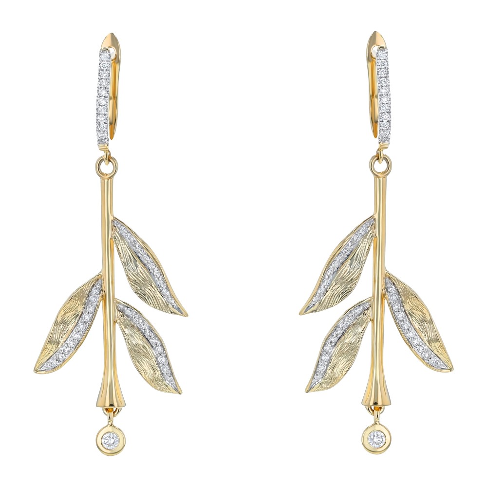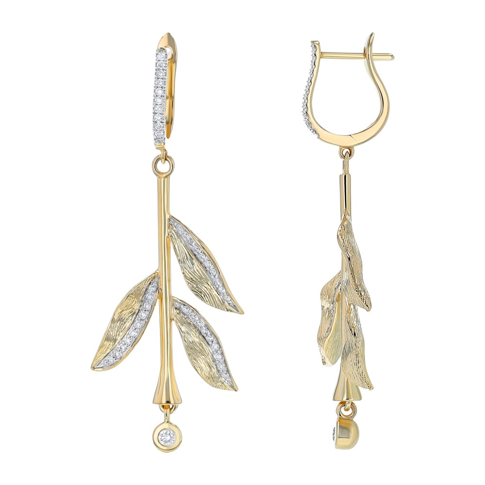 14K yellow gold drop dangle earrings set with 0.50 ct. round diamonds in texured leafs floral.