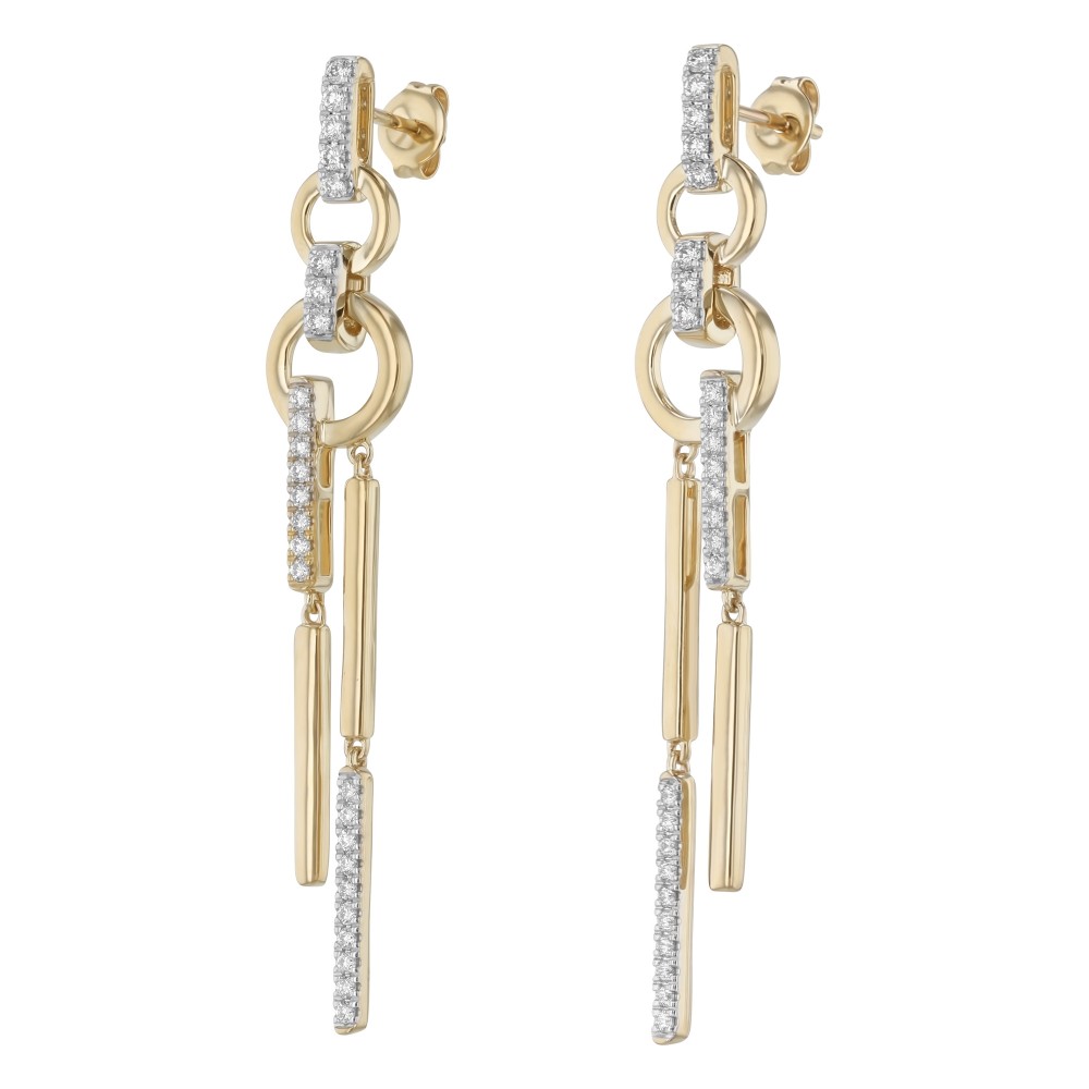 14K yellow gold bars and circles drop earrings set with 0.50 ct. white round diamonds dangling from post and pushback.