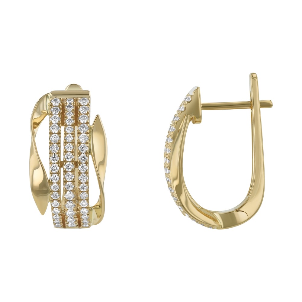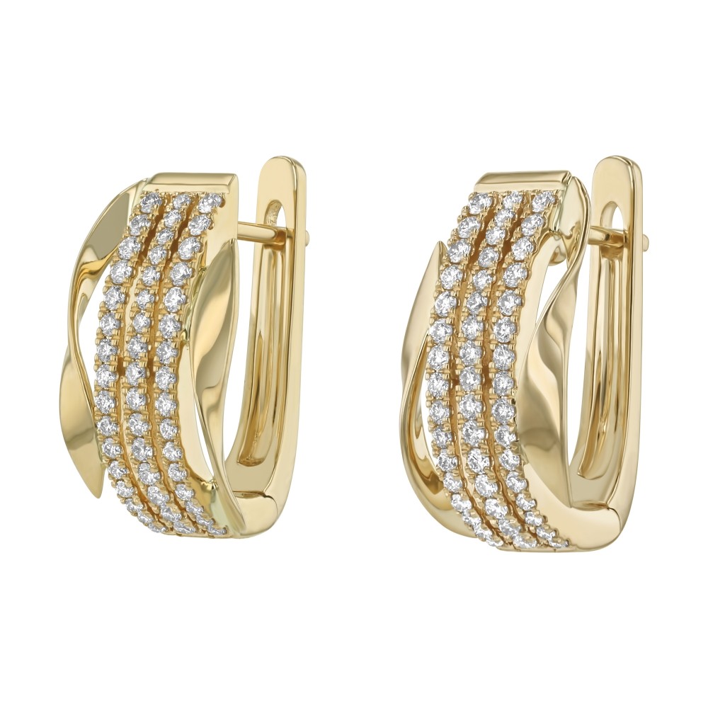 14K yellow gold hinged leverback earrings set with 0.55 ct. round white diamonds in multi-row design.