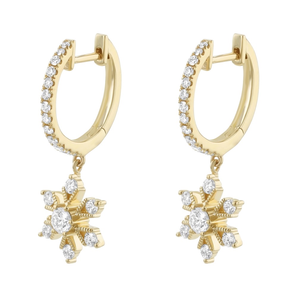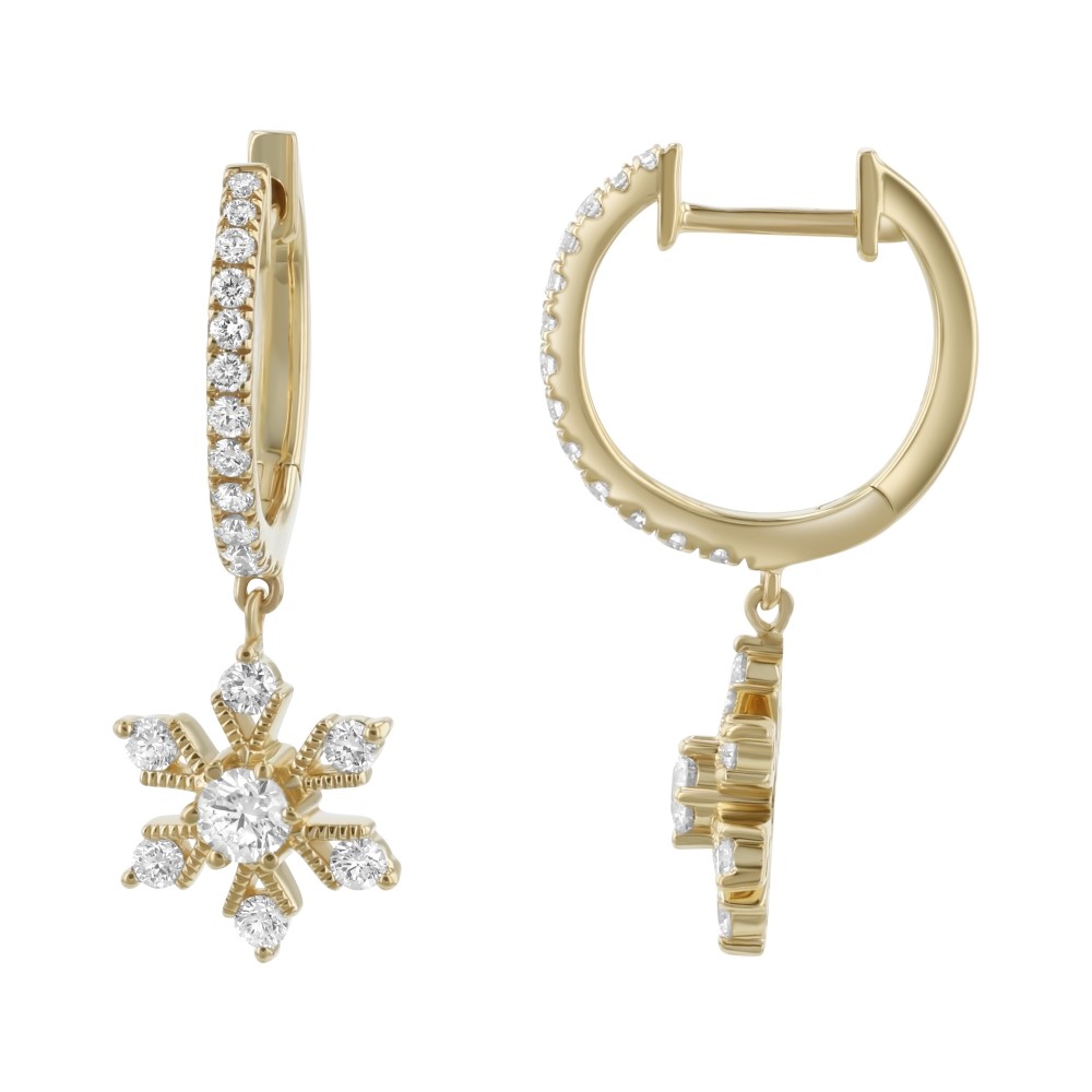 14K yellow gold drop earrings set with 0.70 ct. white round diamonds in snowflake design suspended from oval hoops.
