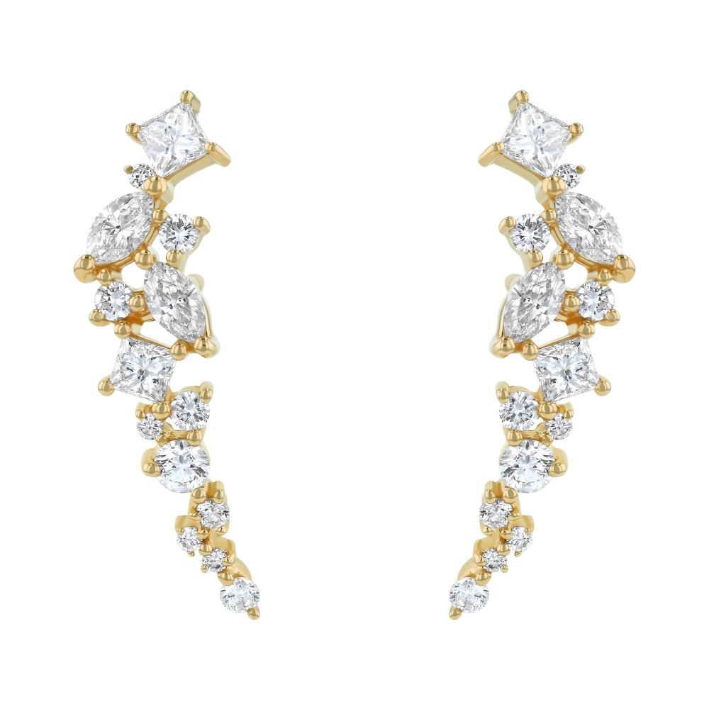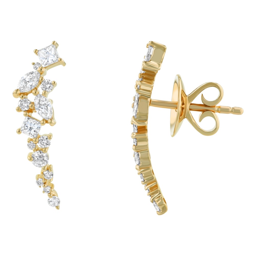 14K yellow gold ear climber style earrings set with 0.75 ct. princess, marquise and round diamonds. Part of our Ear Climbers collection.