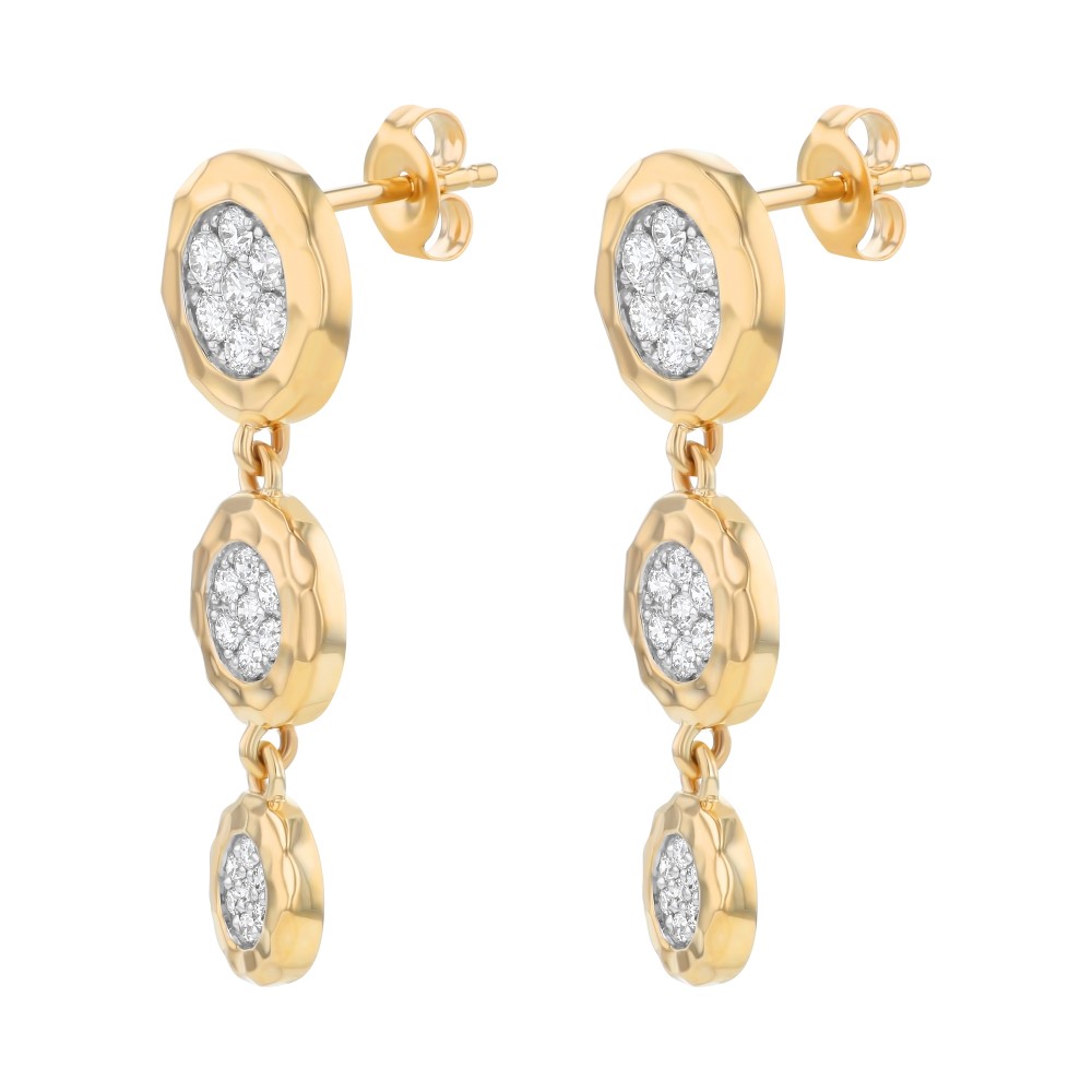 14K yellow gold three graduated sections drop earrings set with 0.75 ct. round diamonds in hammered finish.