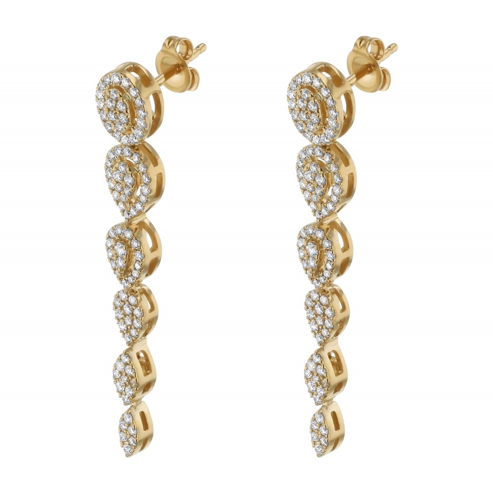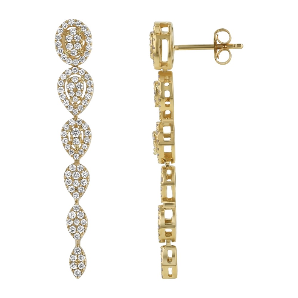 14K yellow gold cascading shaped dangling drop earrings set with 0.95 ct. white round diamonds and suspended from post and pushback.