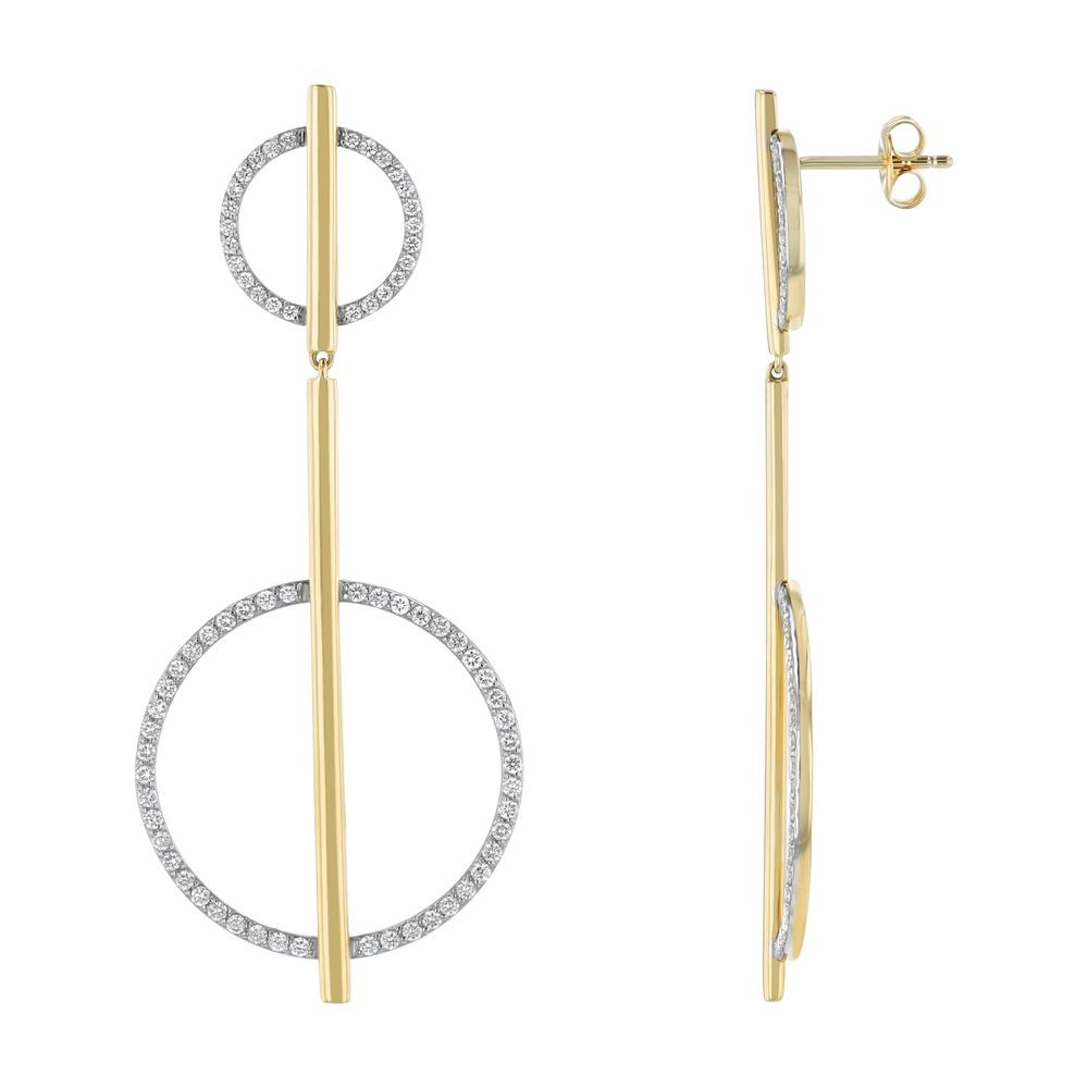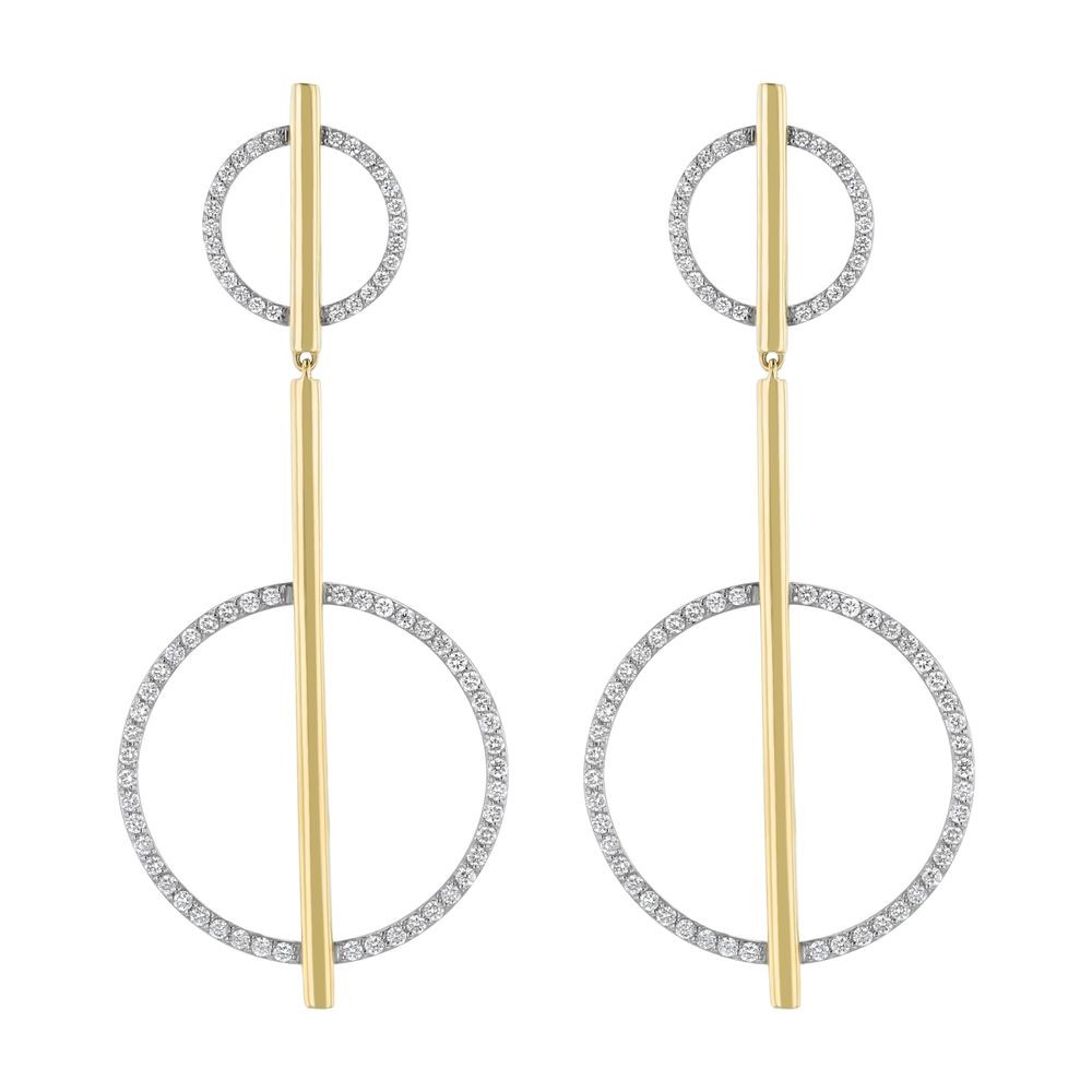 14K yellow gold geometric drop earrings set with 1 carat round brilliant diamonds in double circle design.
