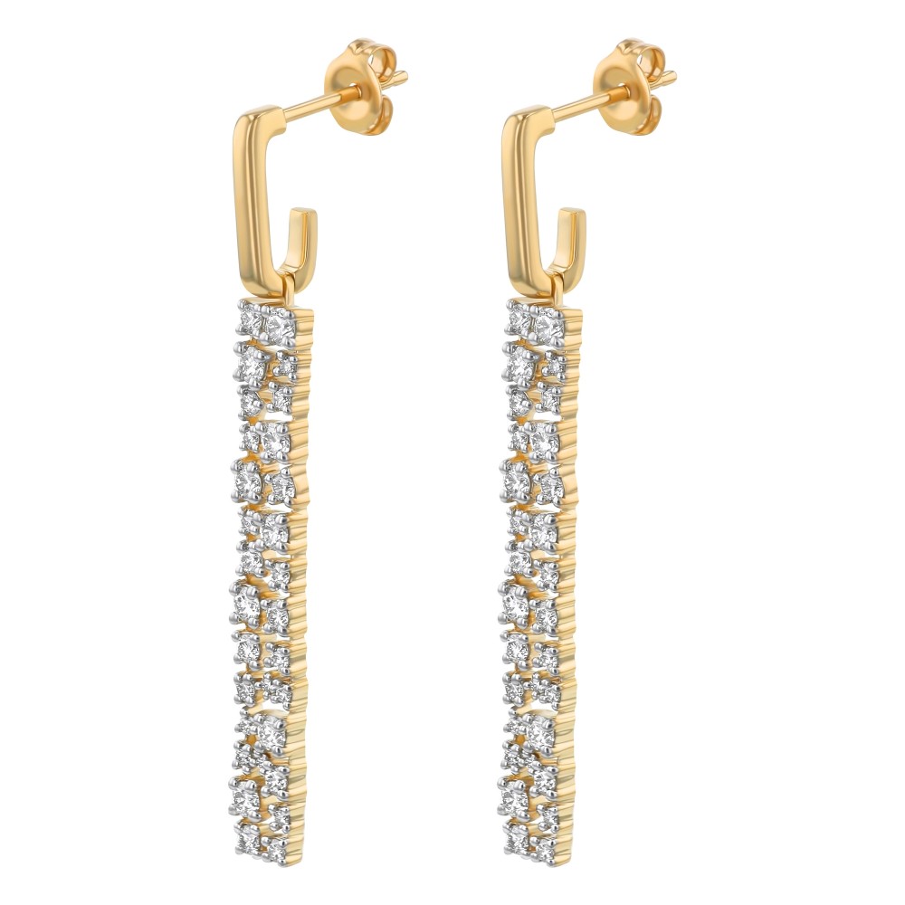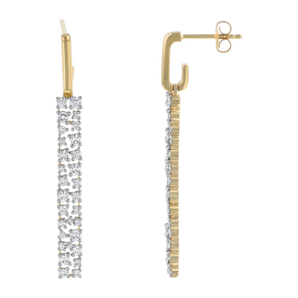 14K yellow gold straigh line drop earrings set with 1.2 ct. white round diamonds and suspended from post and pushback.