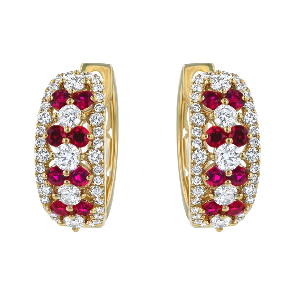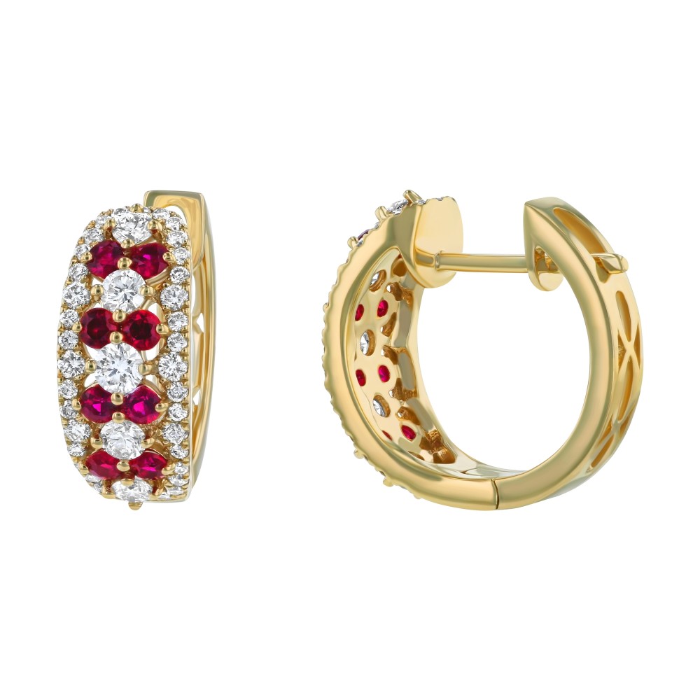 14K yellow gold hoop earrings set with 0.85 ct. round brilliant diamonds and 0.45 ct. round red rubies. The rubies aree natural, not treated.