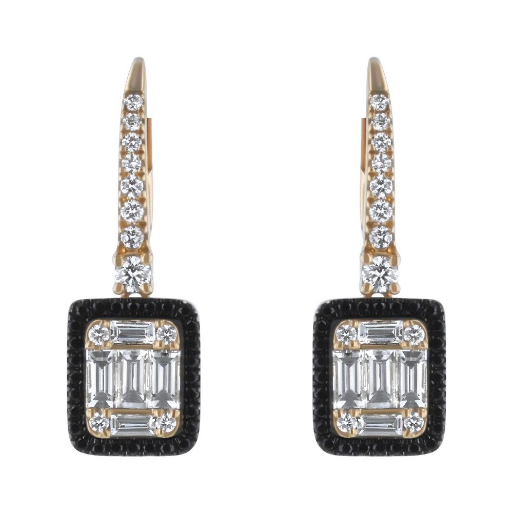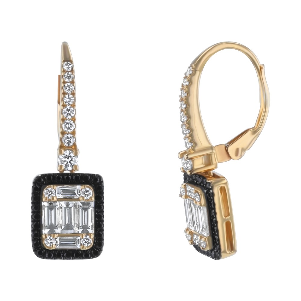 14K yellow gold rectangle shaped leverback earrings set with 0.25 carat round black diamonds and 1.15 carats baguette and round diamonds.