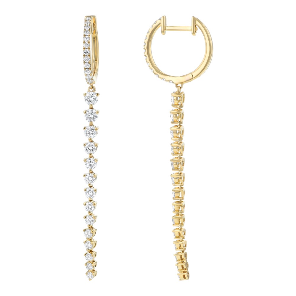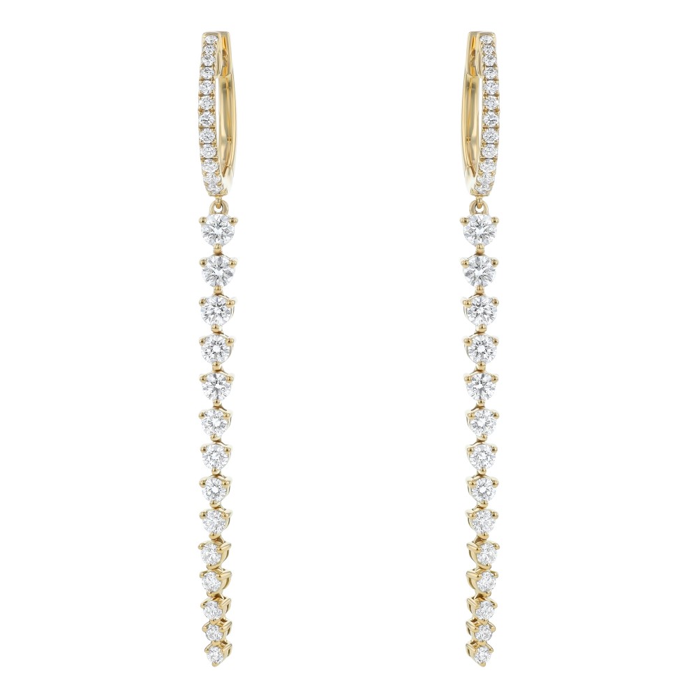 14K yellow gold drop earrings set with 1.40 ct. round diamonds in waterfall dangling design.