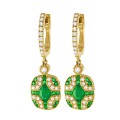 14K yellow gold art deco drop earrings set with 0.60 ct. round brilliant diamonds and 1.10 ct. oval and round green emeralds. The emeralds are natural, not treated.