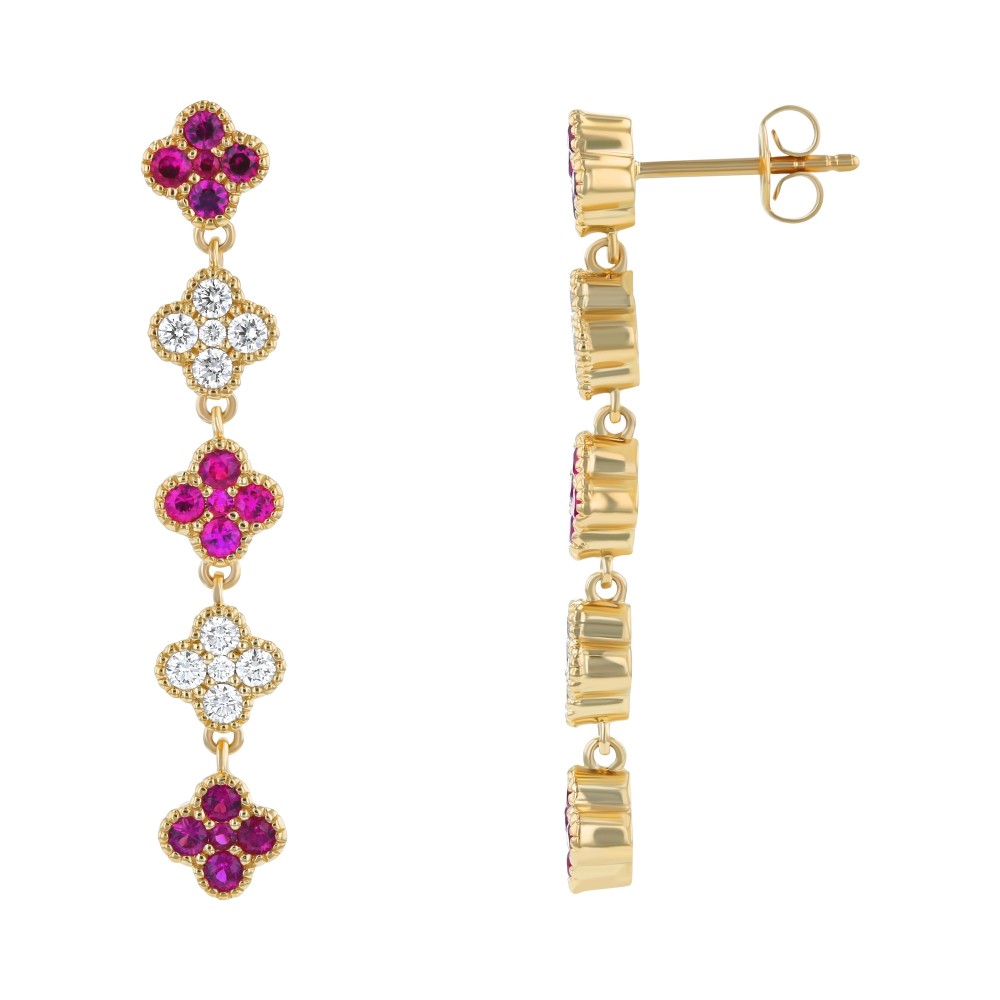 14K yellow gold dangling drop earrings set with 0.55 ct. round brilliant diamonds and 1.25 ct. round red rubies. The rubies aree natural, not treated.
