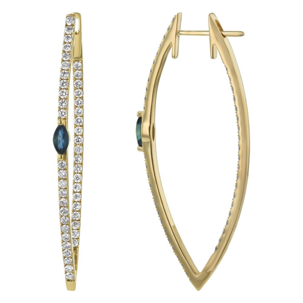 14K yellow gold hoop earrings set inside and out with 1.70 ct. round brilliant diamonds and 0.60 ct. marquise blue sapphires.