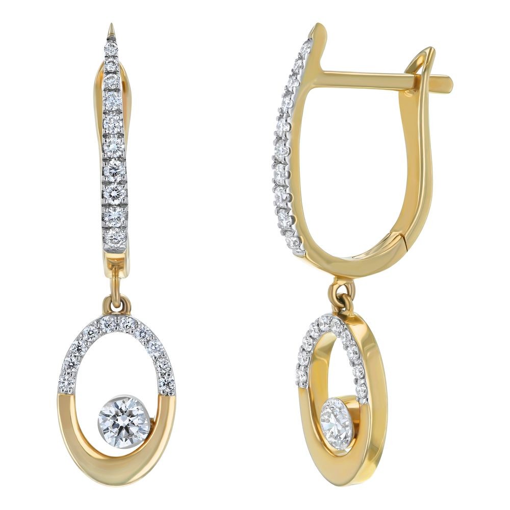 14K yellow gold oval shape earrings dangling from diamond hoops secured with hinged back. Set with 0.37 ct. round diamonds. Part of our MIRAGIO collection.