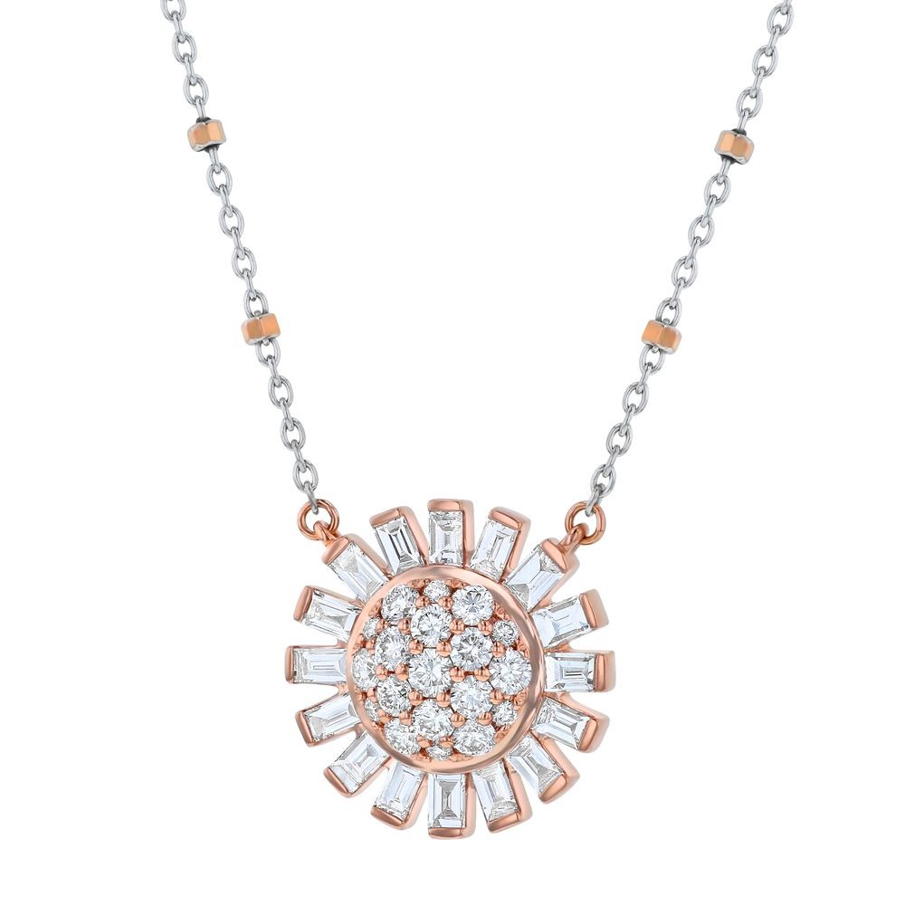 14K rose gold flower necklace set with 0.85 carat baguette and round brilliant diamonds. Chain included.