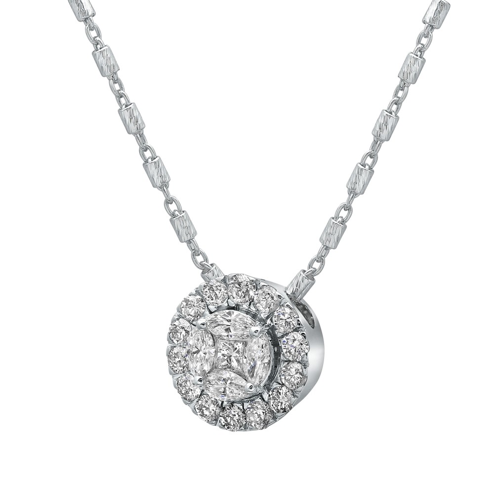 14K white gold round shape fusion necklace set with 1.00 carat of fancy cut princess, marquise and round diamonds. Chain sold separately.