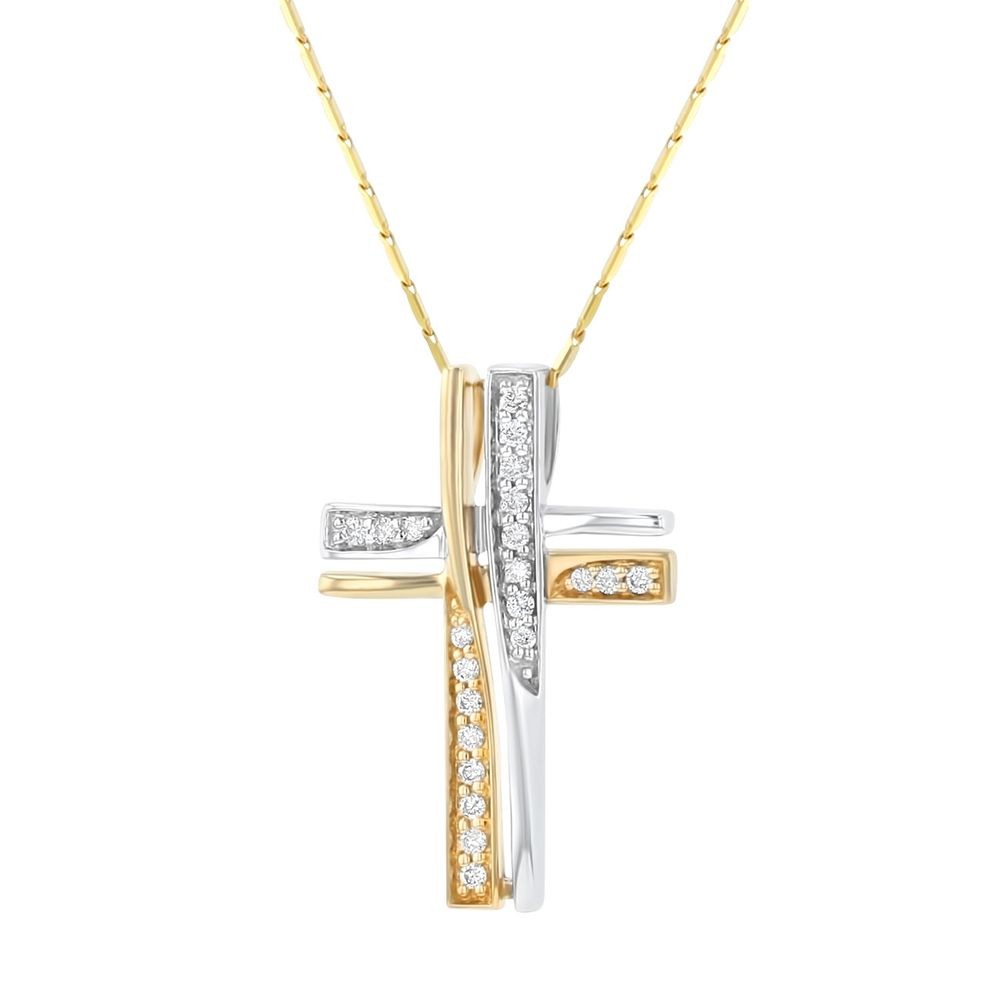 14K two tone yellow and white gold cross pendant set with 0.20 carat round brilliant diamonds. Chain sold separately.