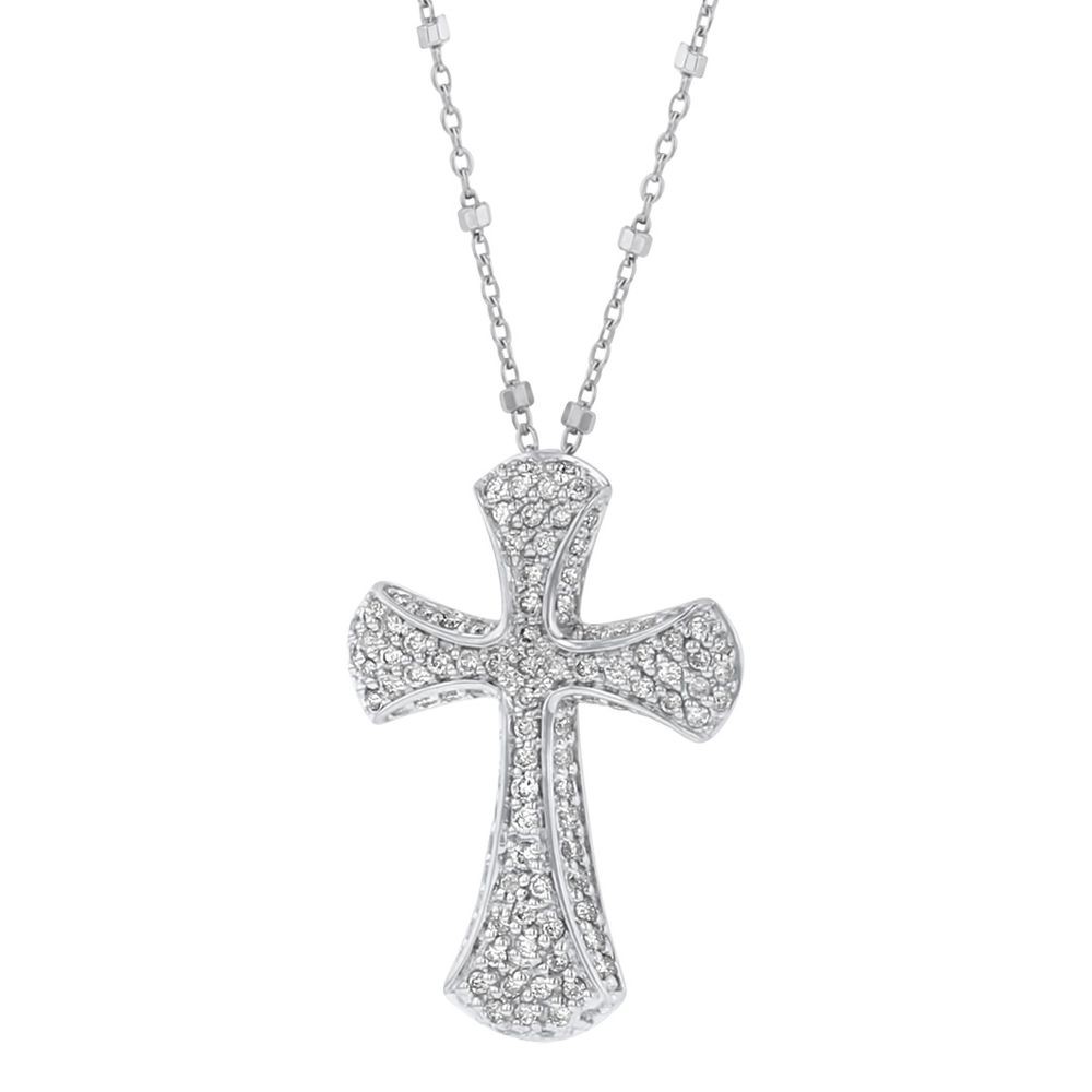14K white gold cross pendant pave set with 0.75 carat round brilliant diamonds. Chain sold separately.
