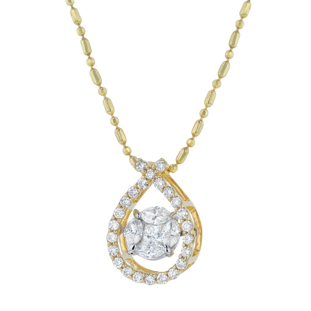 14K yellow gold pear shape necklace set with 0.50 carat Diamonds. The Dancing center features 0.32 carat marquise and princess fusion set diamonds and the halo is set with 0.18 carat round diamonds. Chain sold separately.