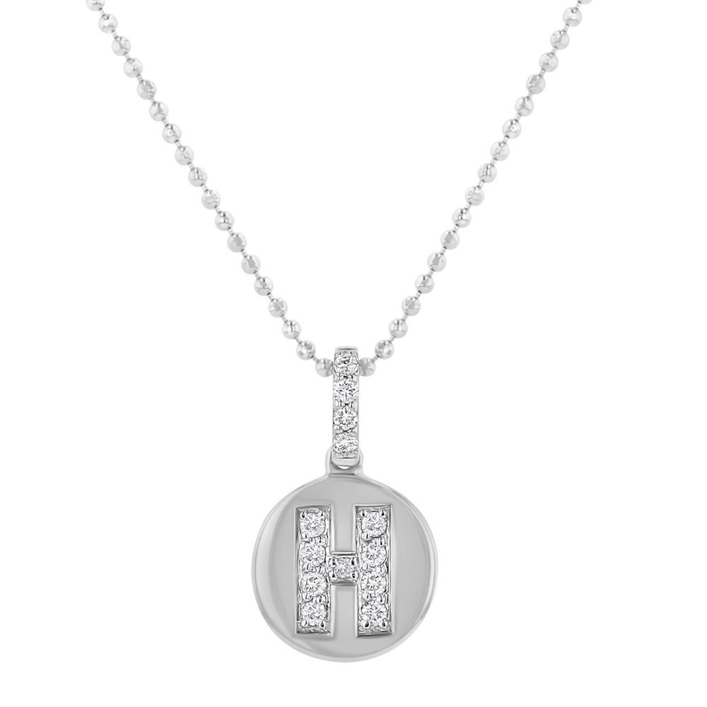 14K white gold round shape disc pendant featuring the letter "H" and set with round brilliant diamonds. Part of our Initials collection. Chain sold separately.