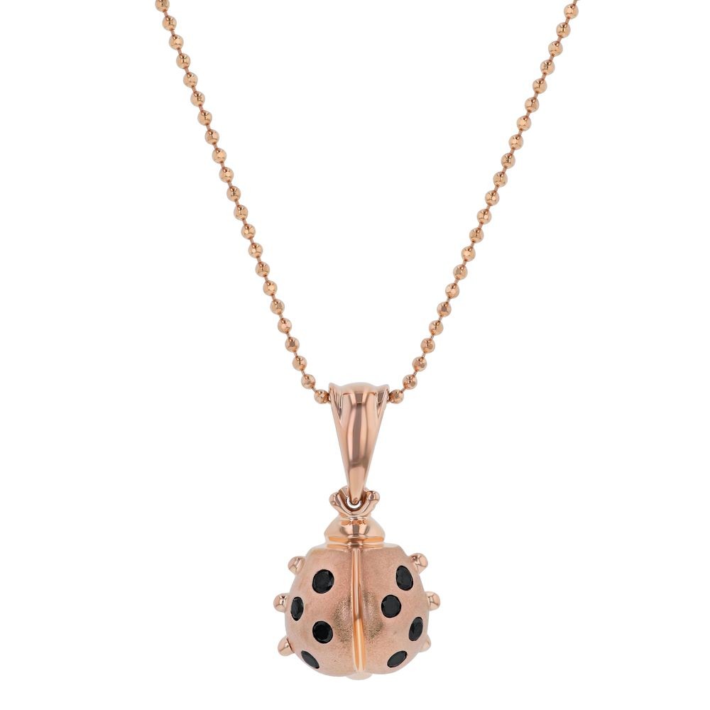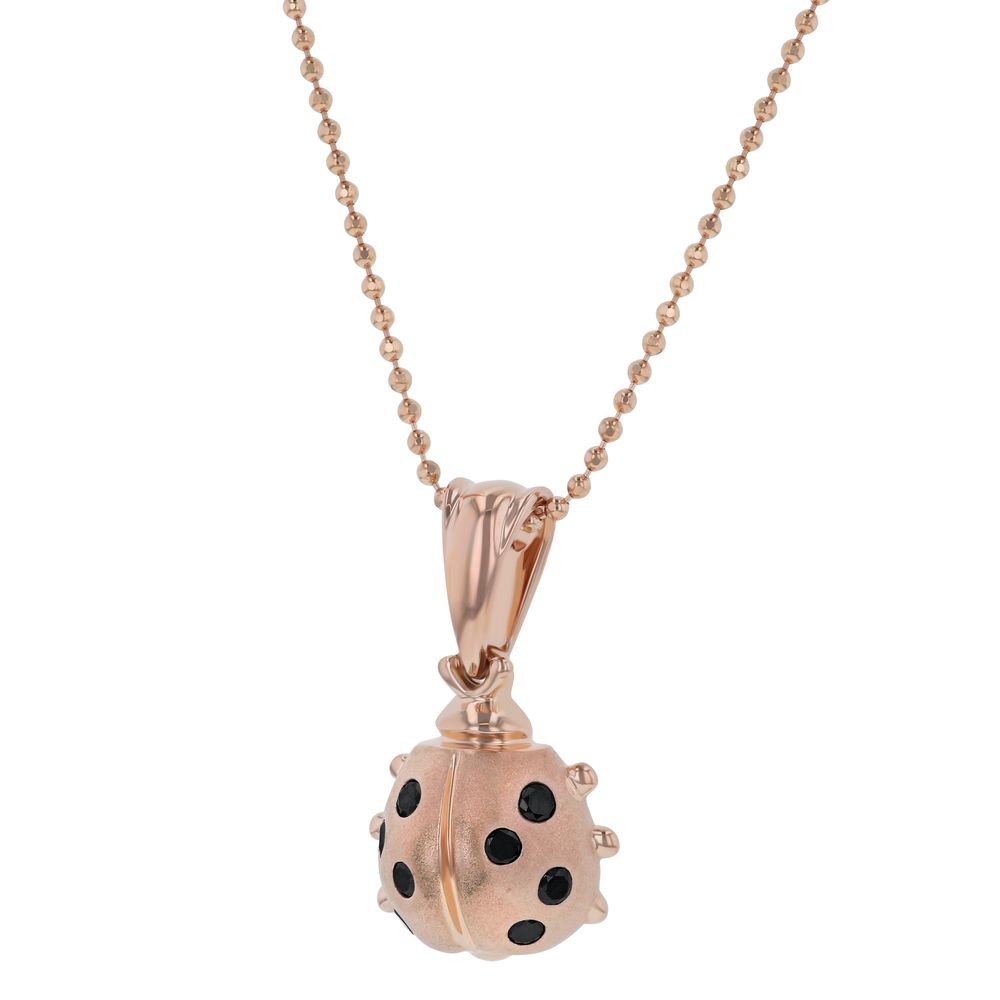 14K rose gold ladybug pendant set with 0.15 carat round brilliant black diamonds and detailed with satin finish. Chain sold separately.