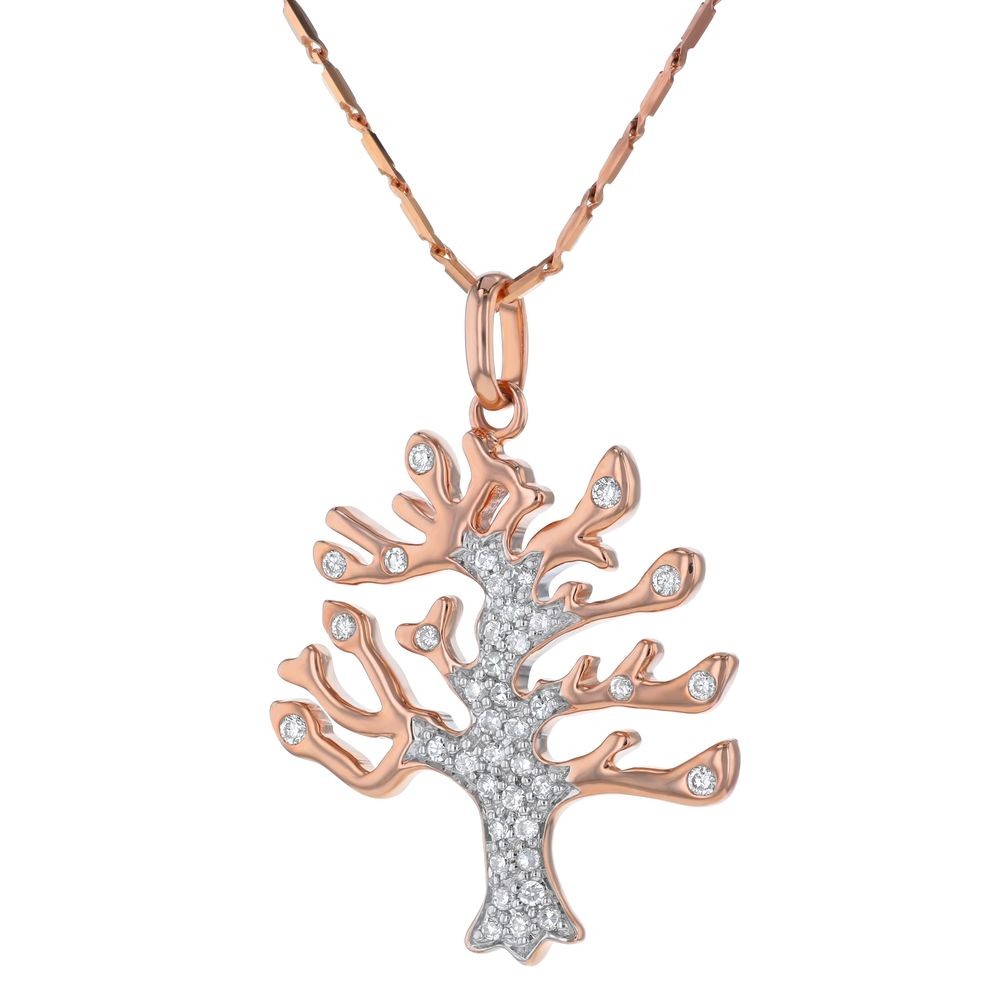 14K rose gold TREE OF LIFE necklace set with 0.25 carat round brilliant diamonds and detailed with white rhodium finish. Chain sold separately.