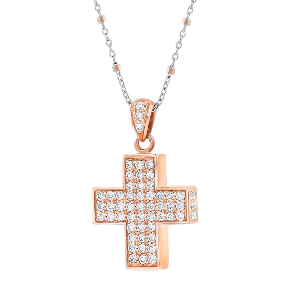 14K rose gold block cross pendant set with 1.0 carat round brilliant diamonds. Chain sold separately.