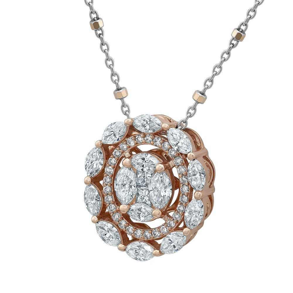 14K rose gold oval shape necklace set with 1.6 carats of fancy cut princess, marquise and round diamonds. Chain sold separately.