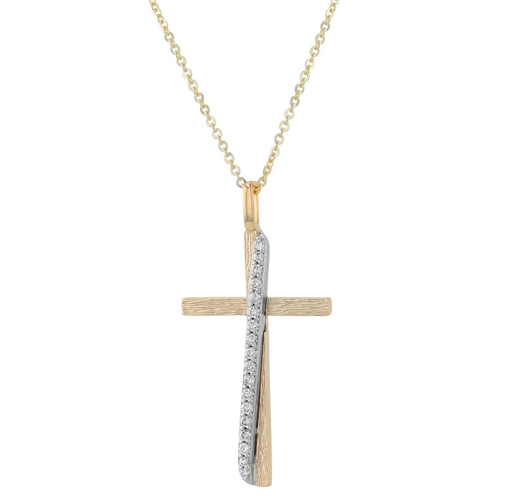 14K two tone yellow and white gold textured cross pendant set with 0.25 carat round brilliant diamonds. Chain sold separately.