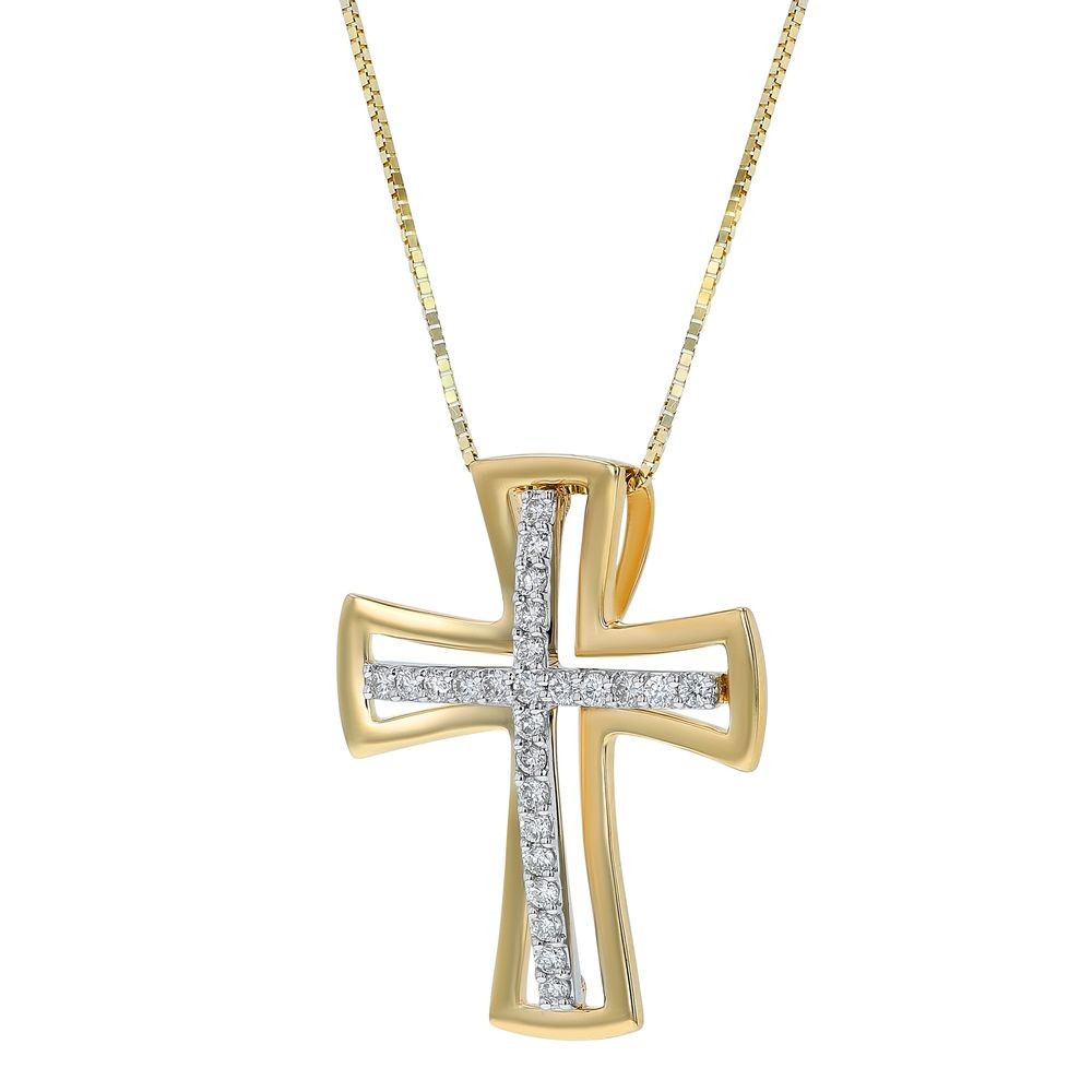 14K two tone yellow and white gold framed cross pendant set with 0.30 carat round brilliant diamonds. Chain sold separately.