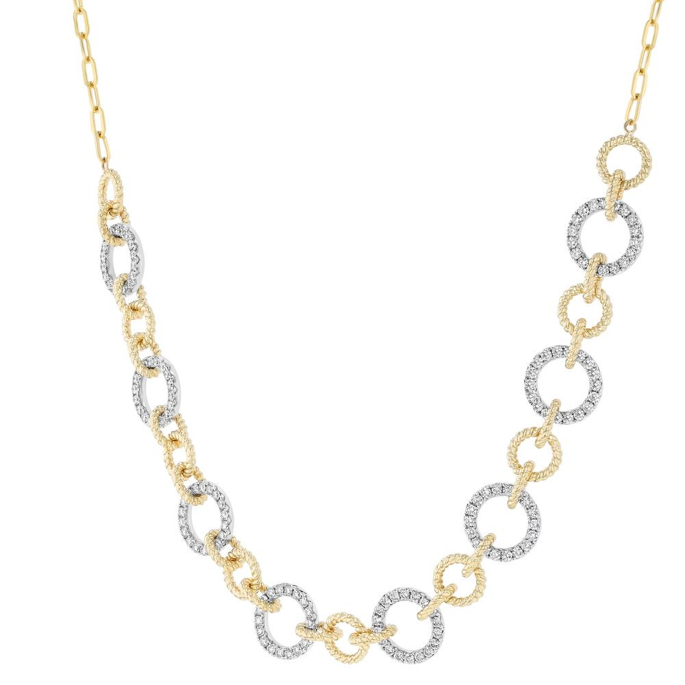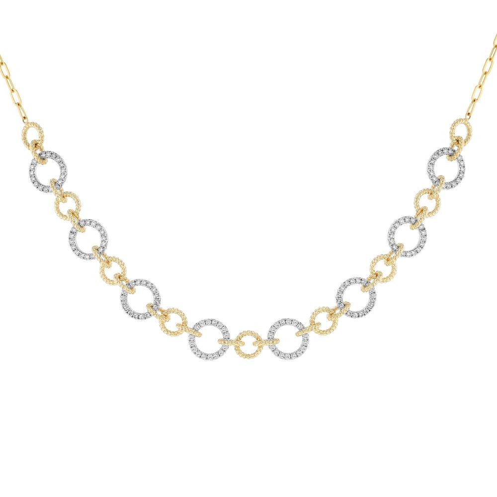 14K two tone yellow and white gold necklace set with 2.70 ct. diamonds in fancy braided links and diamond circles design. The necklace hangs from 18 inches long paperclip chain with lobster clasp.