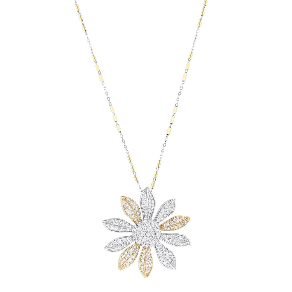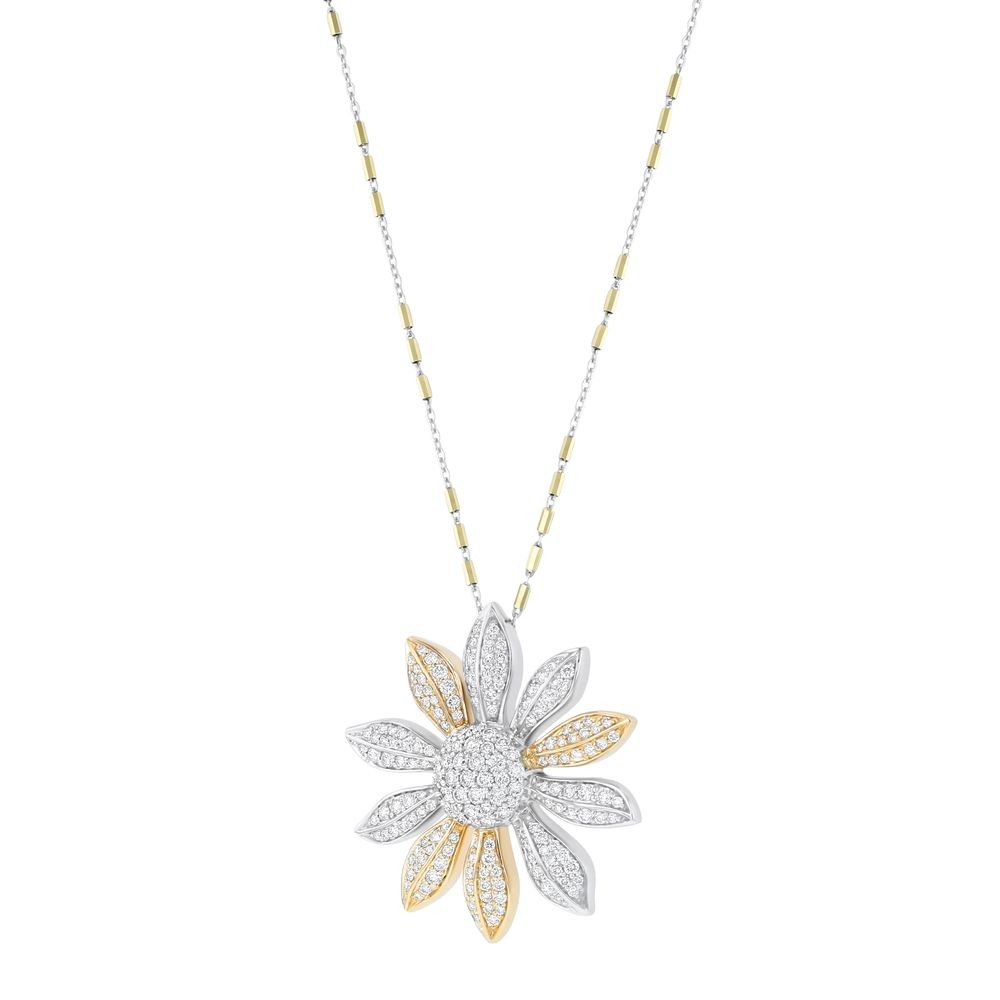 14K two-tone yellow and white gold pendant set with 1.25 carat white round brilliant diamonds in flower design. Chain sold separately.