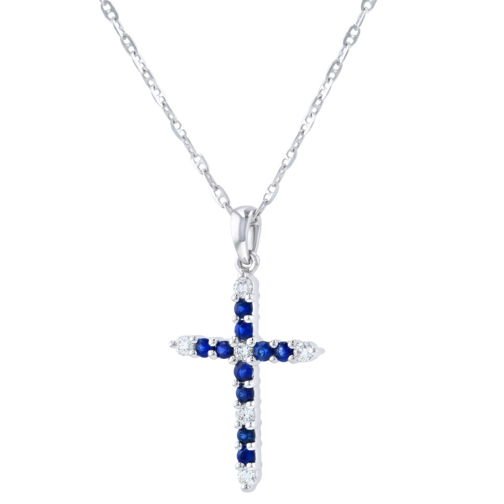 14K white gold cross pendant set with 0.09 carat round brilliant white diamonds and 0.17 carat natural blue sapphires. Chain sold separately.