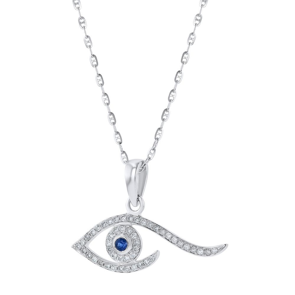 14K white gold evile eye necklace set with 0.20 carat round brilliant diamonds and 0.05 carat blue sapphire. Chain sold separately.