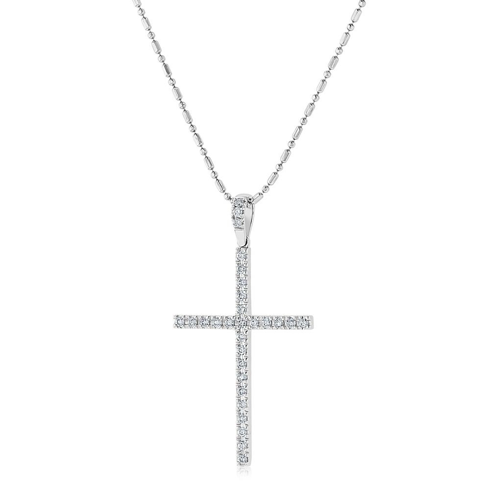 14K white gold straight line cross pendant set with 0.30 carat round brilliant diamonds. Chain sold separately.