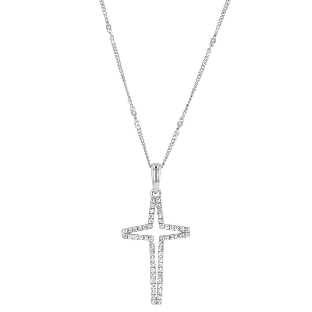 14K white gold cross pendant set with 0.30 carat round brilliant diamonds. Chain sold separately.