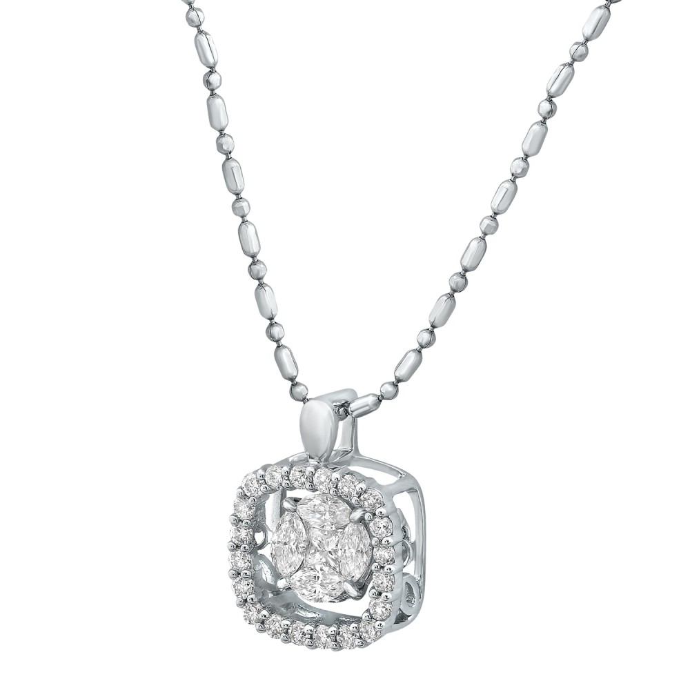 14K white gold cushion shaped necklace set with 0.50 carat Diamonds. The Dancing center features 0.32 carat marquise and princess fusion set diamonds and the halo is set with 0.20 carat round diamonds. Chain sold separately.