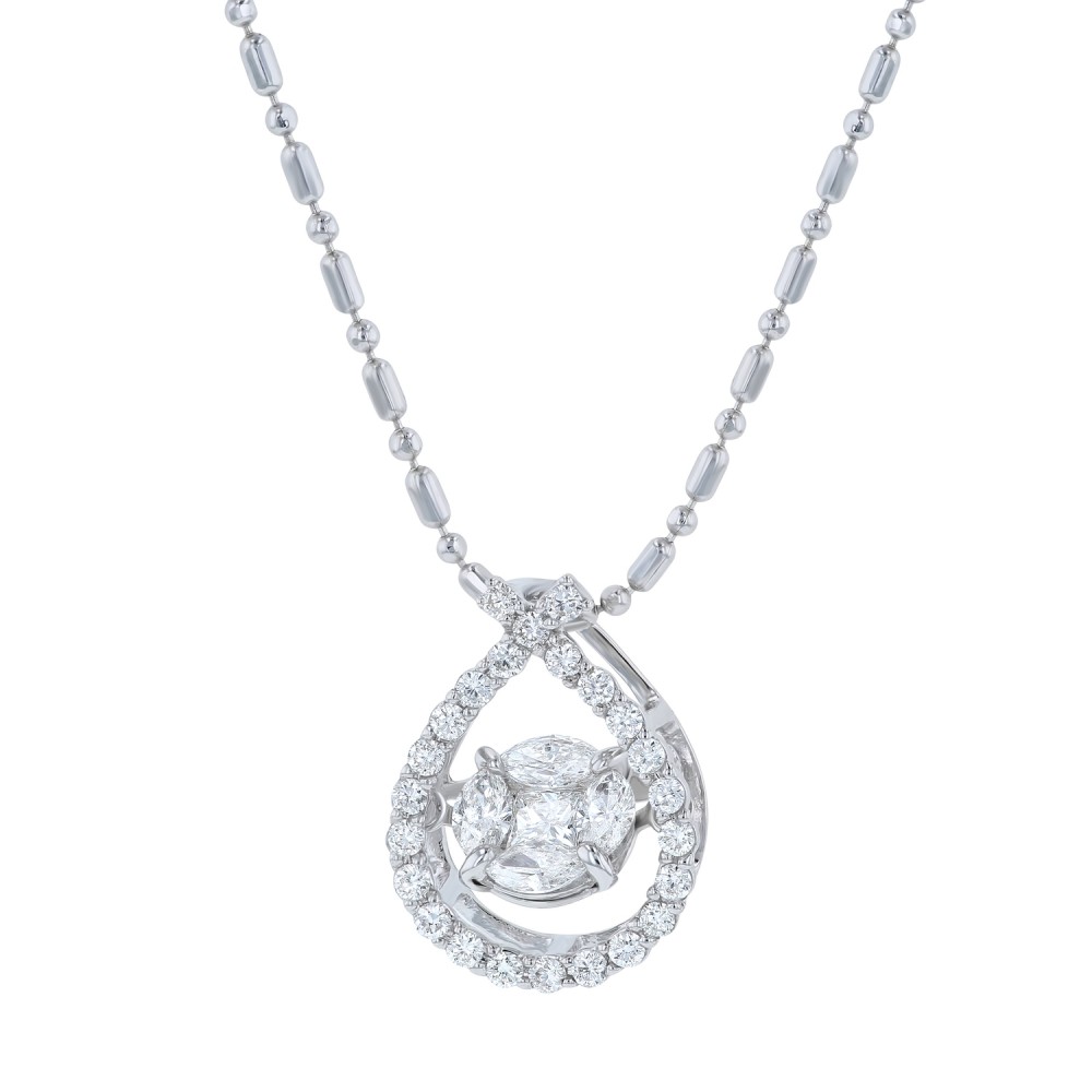 14K white gold pear shape necklace set with 0.50 carat Diamonds. The Dancing center features 0.32 carat marquise and princess fusion set diamonds and the halo is set with 0.18 carat round diamonds. Chain sold separately.
