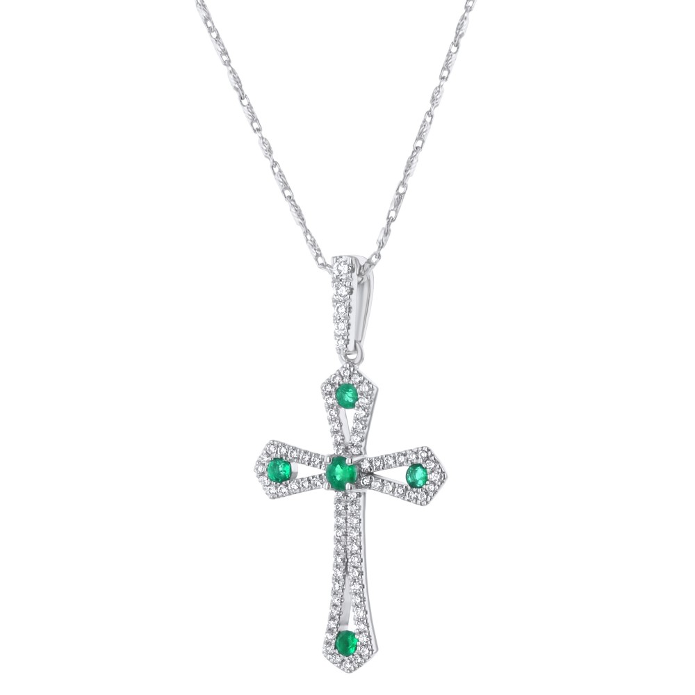 14K white gold cross pendant set with 0.35 carat round brilliant white diamonds and 0.25 carat natural green emeralds. Chain sold separately.
