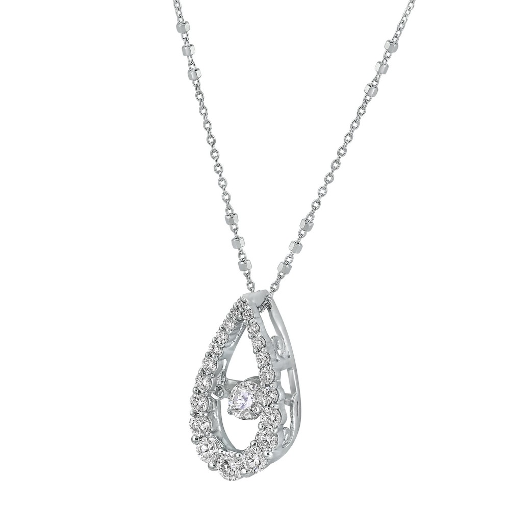 14K white gold pear shape necklace set with 0.20 carat center Dancing diamond and 0.50 carat halo diamonds. Chain sold separately.