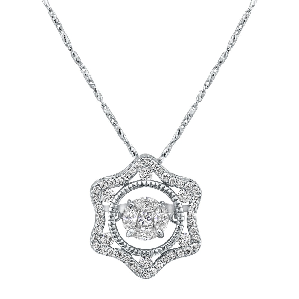 14K white gold star shaped necklace set with 0.70 carat Diamonds. The Dancing center features 0.32 carat marquise and princess fusion set diamonds and the halo is set with 0.38 carat round diamonds. Chain sold separately.