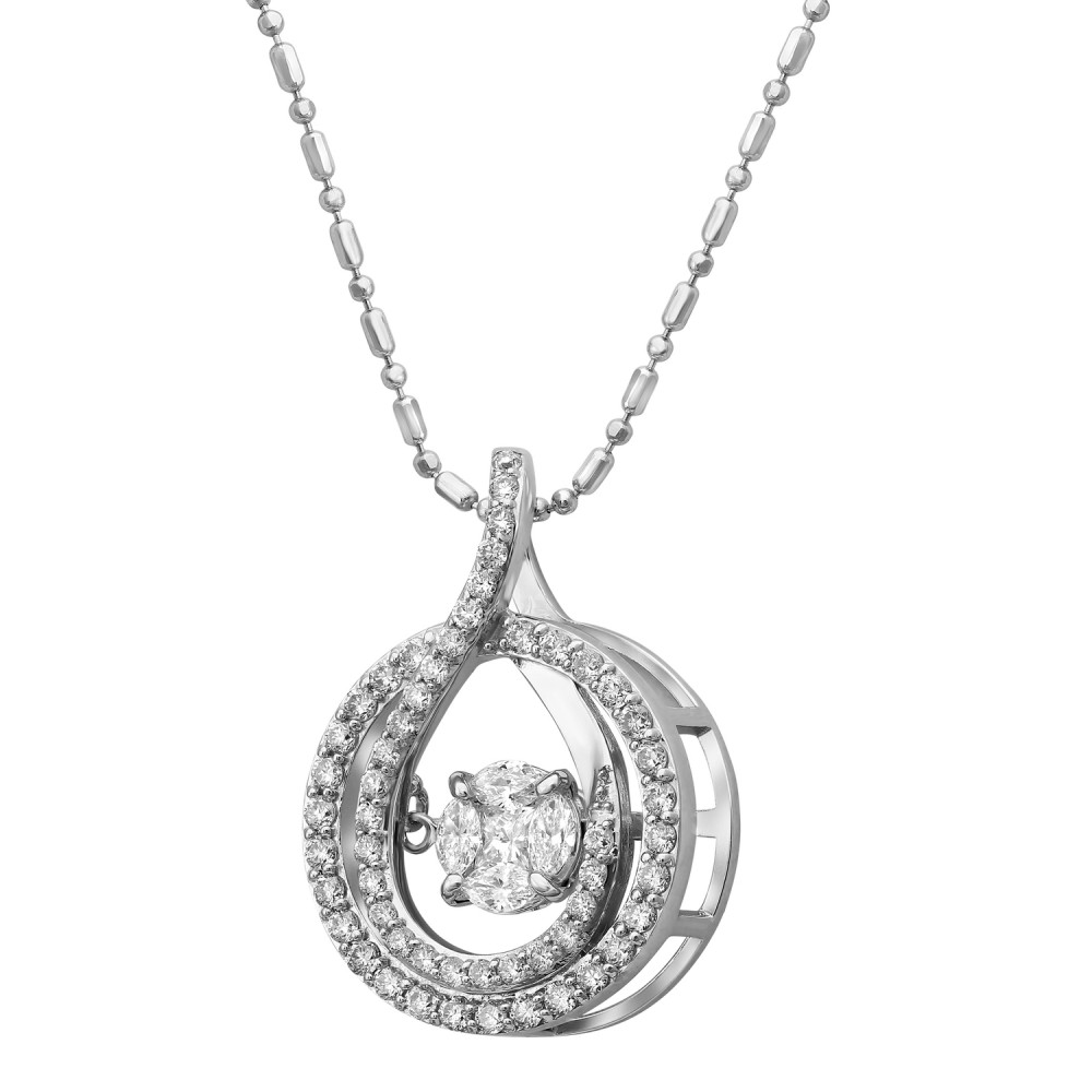14K white gold necklace set with 0.75 carat Diamonds. The Dancing center features 0.32 carat marquise and princess fusion set diamonds and the halo is set with 0.44 carat round diamonds. Chain sold separately.
