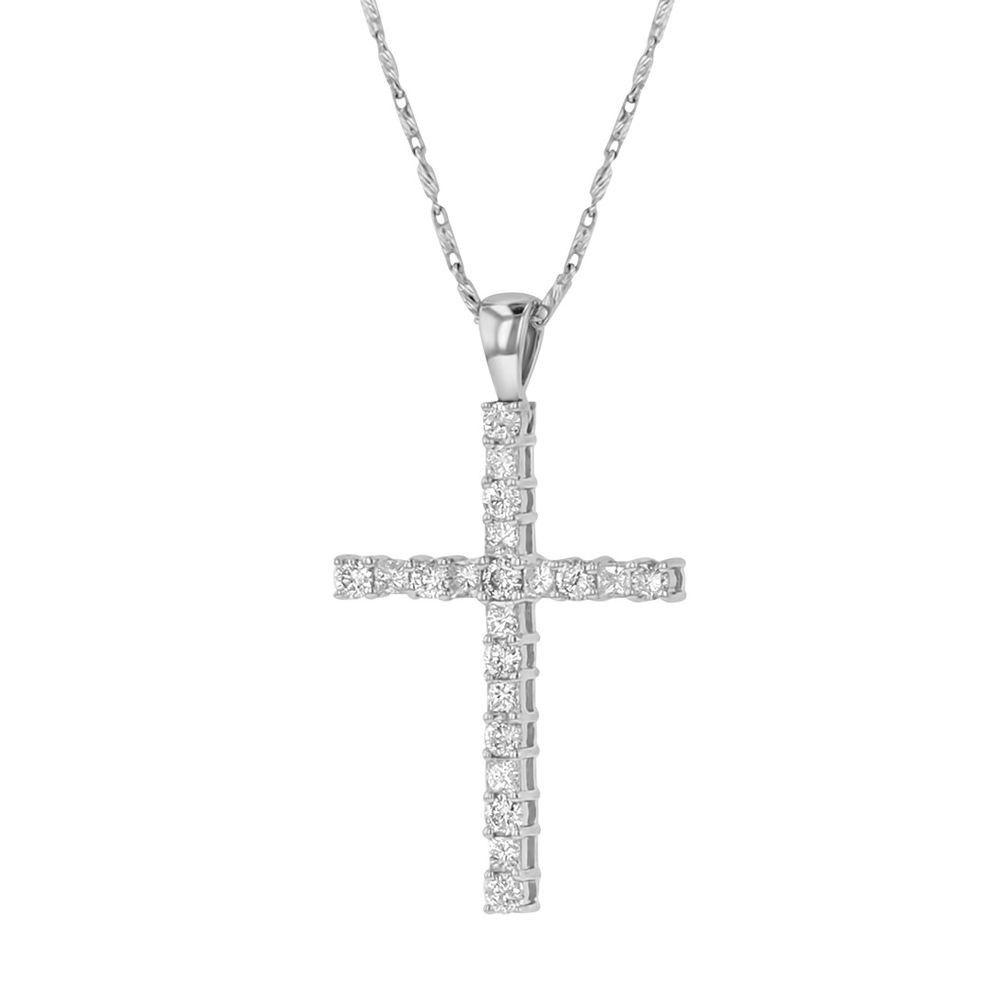 14K white gold straight line cross pendant set with 0.35 carat princess and 0.40 carat round brilliant diamonds in prong settings. Chain sold separately.