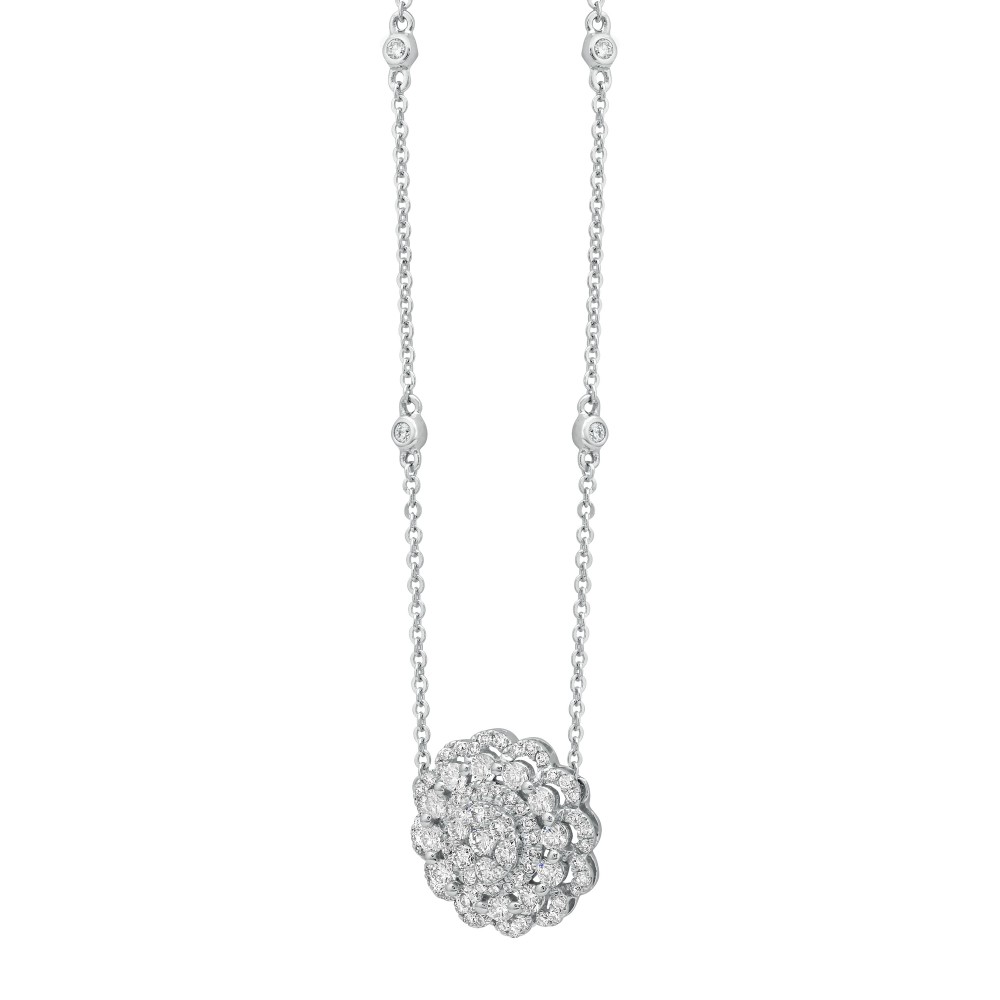 14K white gold layered halo flower necklace set with 0.80 carat round brilliant diamonds and bezel set diamonds chain. Price includes chain.