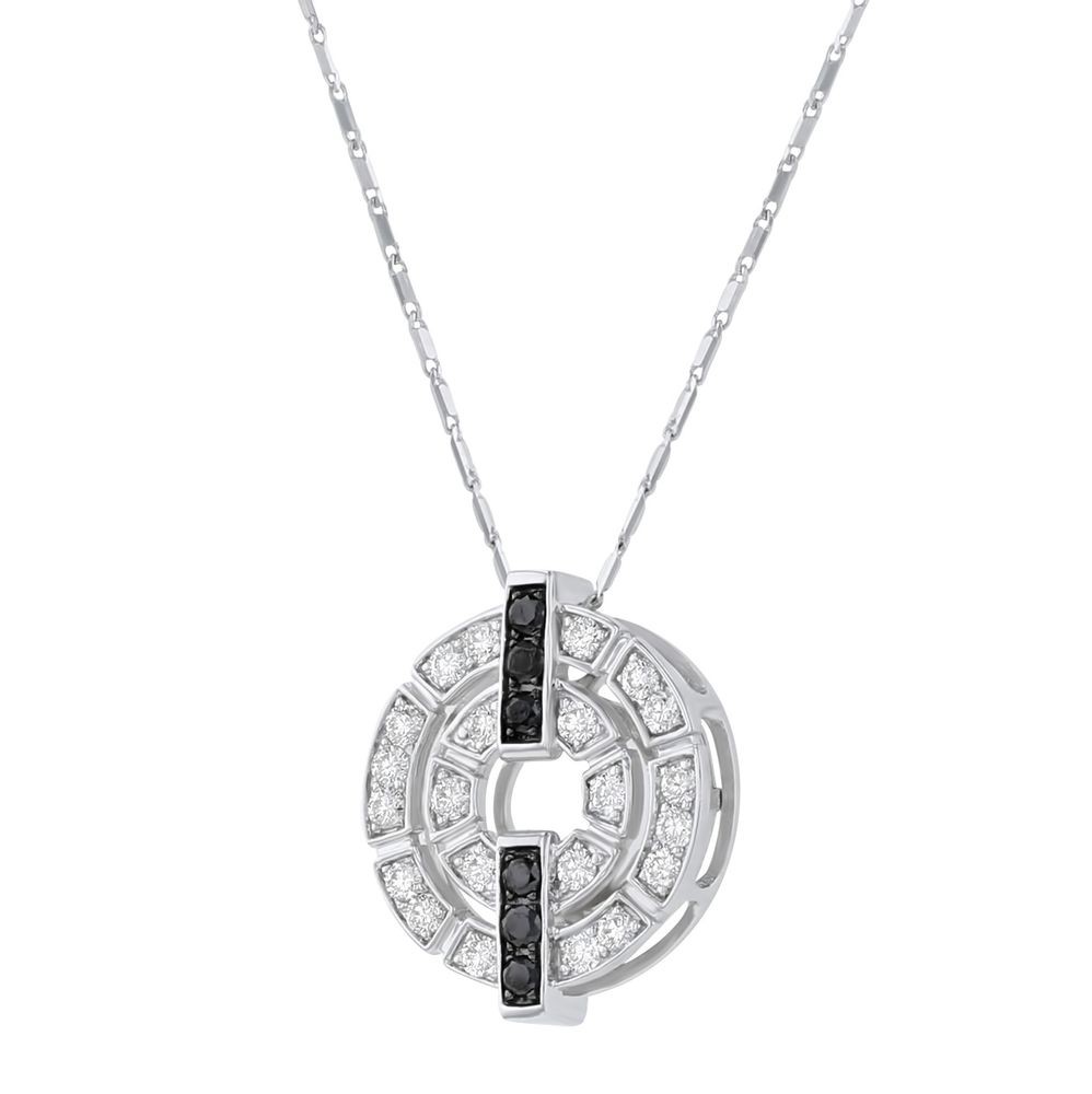 14K white gold geometric pendant set with 0.7 carat white and 0.2 carat black round brilliant diamonds in double circle design. Chain sold separately.