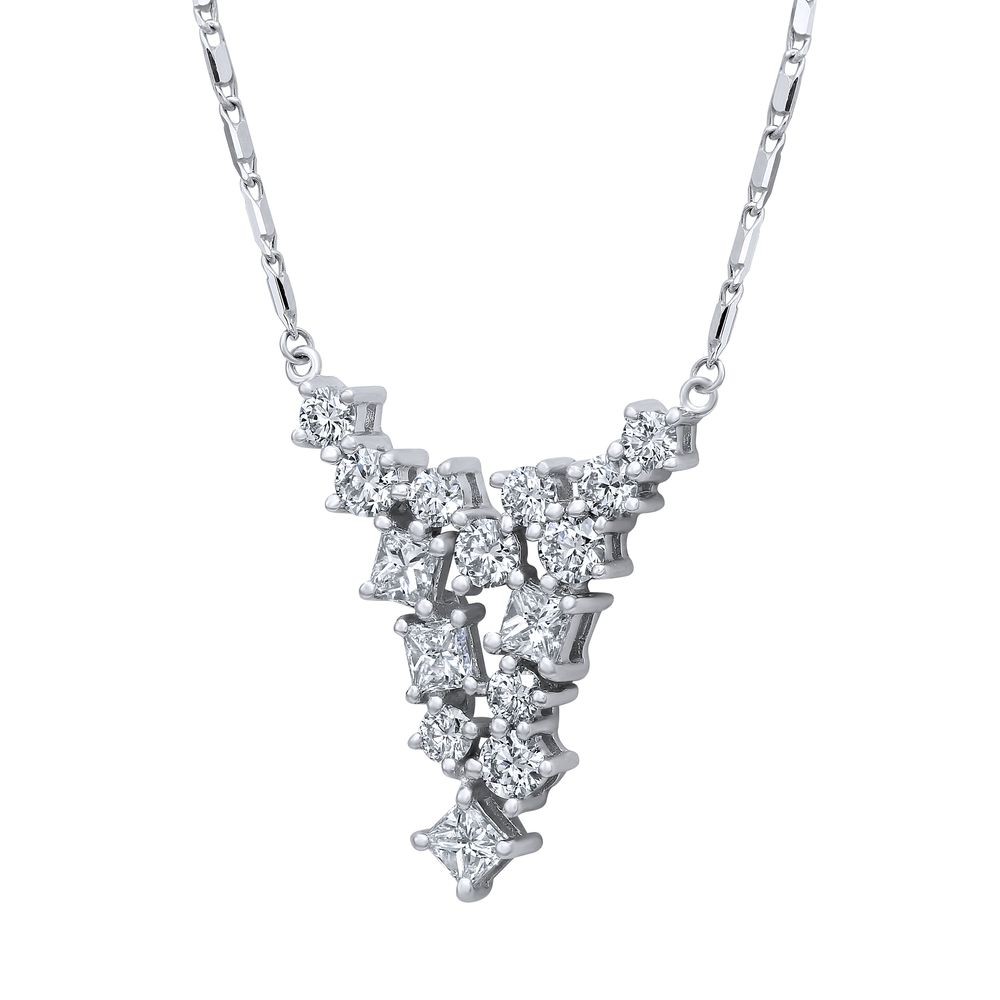 14K white gold triangle shaped "bikini" necklace set with 0.90 carat of fancy cut princess and round diamonds. Chain included.