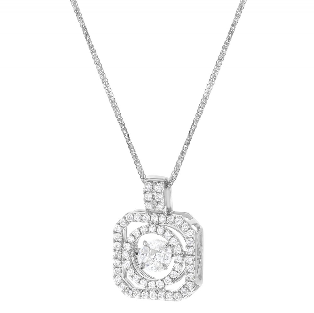 14K white gold octagon shaped necklace set with 0.95 carat Diamonds. The Dancing center features 0.32 carat marquise and princess fusion set diamonds and the halo is set with 0.65 carat round diamonds. Chain sold separately.