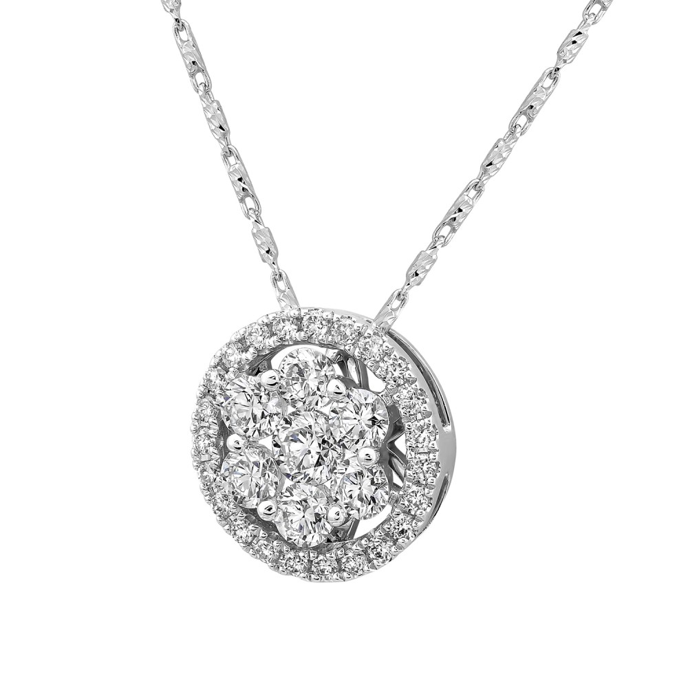 14K white gold round halo pendant set with 1.00 carat round brilliant diamonds in 7 stone flower design. Chain sold separately.