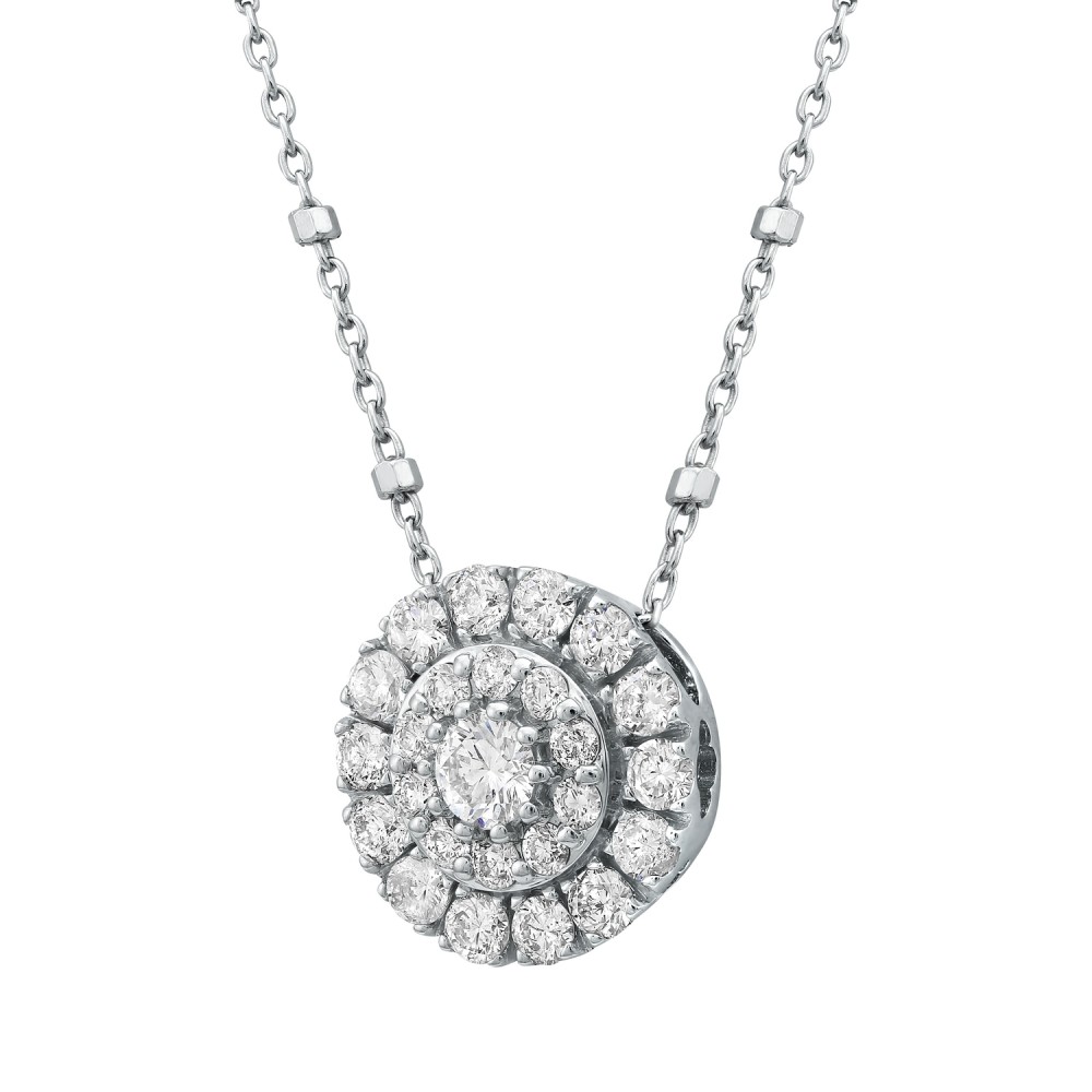 14K white gold round halo pendant set with 1.00 carat round brilliant diamonds. Chain sold separately.