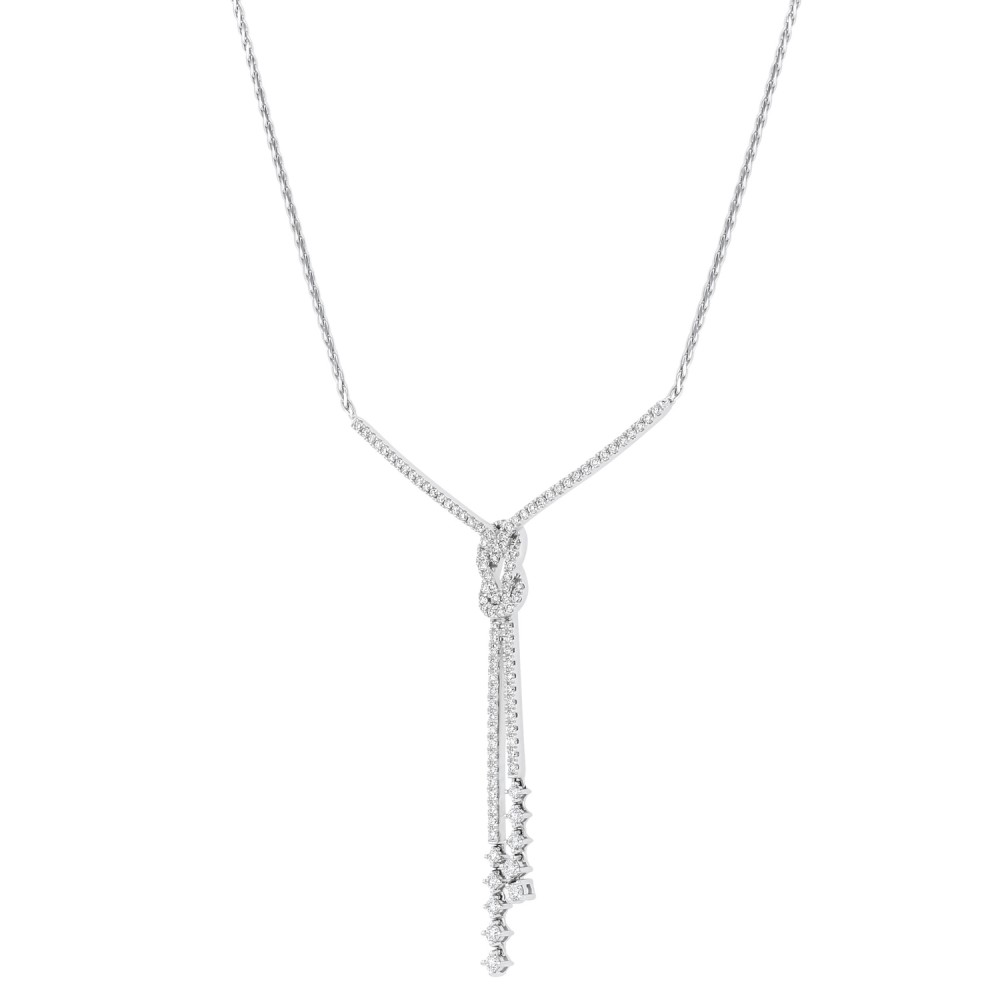 14K white gold Y necklace with knot design set with 1.00 carat round brilliant diamonds. Price includes chain.