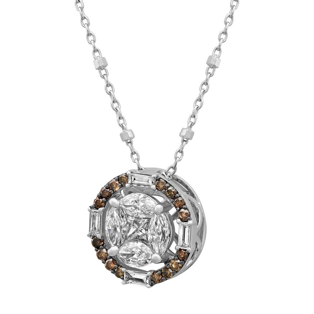 14K white gold round shaped necklace set with 0.95 carat of princess, marquise and baguette white diamonds and 0.15 carat round black diamonds. Chain sold separately.