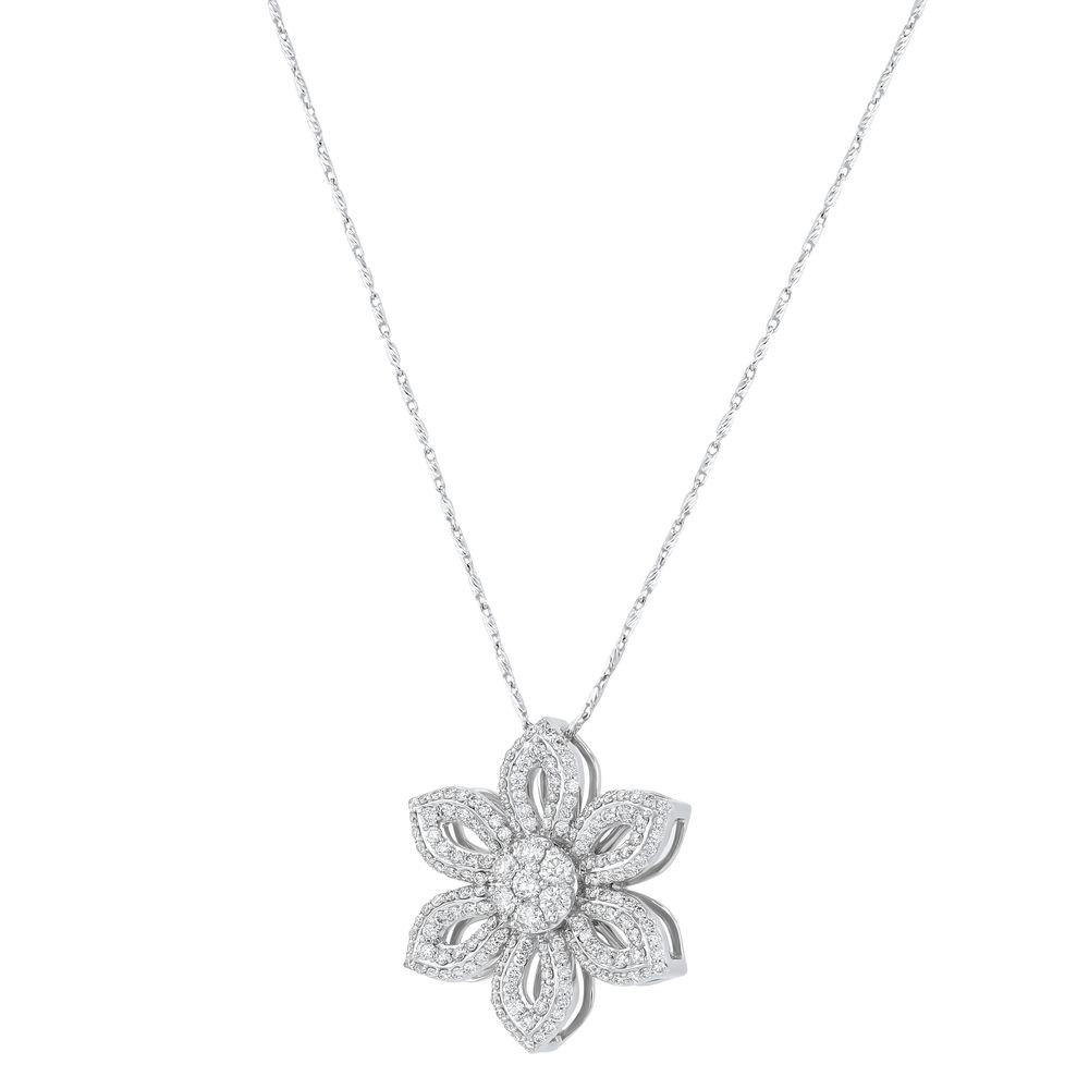 14K white gold pendant set with 1.10 carat white round brilliant diamonds in flower design. Chain sold separately.